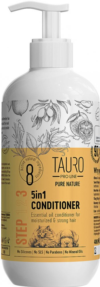 Hydratační kondicionér na srst Tauro Pro Line Pure Nature 5v1 pro psy a kočky je formulován tak, aby jemně obnovoval suchou nebo dehydrovanou srst tím, že ji intenzivně hydratuje. Jedinečné složení pouze přírodních účinných látek podporuje hlubokou hydrataci kůže a srsti, zanechává srst snadno rozčesatelnou a účinně vyplňuje a zahušťuje poškozenou a narušenou strukturu srsti. Exkluzivní složení přírodních a esenciálních olejů může pomoci: Olivový olej zabraňuje praskání konečků, protože může zvýšit pružnost chlupů. Esenciální olej ze sladkého pomeranče zlepšuje hladkost pramenů a zvlhčuje lámavou srst. Muru Muru máslo hydratuje a zadržuje vlhkost v kůži, takže srst je jemnější. Esenciální olej Ylang Ylang zlepšuje strukturu srsti a snižuje lámavost chlupů. Esenciální olej z rozmarýnu chrání před vypadáváním srsti a podporuje růst zdravé, husté srsti. Limetkový esenciální olej podporuje zdravou srst, dělá ji svěží a hladší. Testováno profesionály: Bezpečné složení – bez silikonů, parabenů a SLS. Vyvinuté chovateli – spolehlivé, špičkové produkty. Použití: Zřeďte kondicionér v poměru 1:10 s vodou. Po umytí šamponem jemně vmasírujte do srsti. Asi po 3 minutách vmasírujte a pročesejte. Důkladně opláchněte teplou vodou. UPOZORNĚNÍ: Pouze pro vnější použití. Chraňte před dětmi.