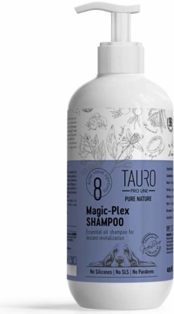 Šampon Tauro Pro Line Pure Nature Magic-Plex obnovuje a chrání srst vašeho mazlíčka před každodenním stresem, včetně poškozených chlupů, roztřepených konečků a vypadávání. Srst se stává snadněji ovladatelnou, obnovenou, lesklou a zdravou po každém použití. Jedná se o restrukturalizační šampon, který dokáže snížit lámavost srsti a posílit všechny typy srsti. Jedinečná synergie přírodních a esenciálních olejů hloubkově a šetrně vyčistí srst. Jedinečné složení 8 přírodních a esenciálních olejů může pomoci: Arganový olej chrání srst před každodenním poškozením. Olej ze santalového dřeva pro ošetření roztřepených konečků, zlepšení lesku a růstu srsti. Esenciální olej Neroli pro snížení lupů, svědění a suchosti. Šípek pro podporu zdravého růstu srsti. Olej z muškátového oříšku pomáhá předcházet vypadávání srsti. Myrtový esenciální olej pro posílení chlupových kořínků a stimulaci růstu srsti. Mahagonový olej , díky kterému je srst hladká, měkká a snadno se rozčesává. Olej z mrkvových semínek změkčuje, texturuje a opravuje poškozenou srst. Testováno profesionály: Bezpečné složení – bez silikonů, parabenů a SLS. Vyvinuté chovateli – spolehlivé, špičkové produkty. Použití: Šampon nařeďte vlažnou vodou 1:10, namočte srst a rozetřete přípravek. Masírujte asi 3 minuty a dobře opláchněte vlažnou vodou. Pro lepší účinek použijte kondicionér a Tauro Pro Line Pure Mist. Doporučeno: pro obnovu srsti zvířete, podporu její regenerace a růstu. Pro psy a kočky. Jeho ultra jemné složení je ideální pro domácí mazlíčky s citlivou kůží. UPOZORNĚNÍ: Pouze pro vnější použití. Chraňte před dětmi. Vyrobeno v Evropské unii.