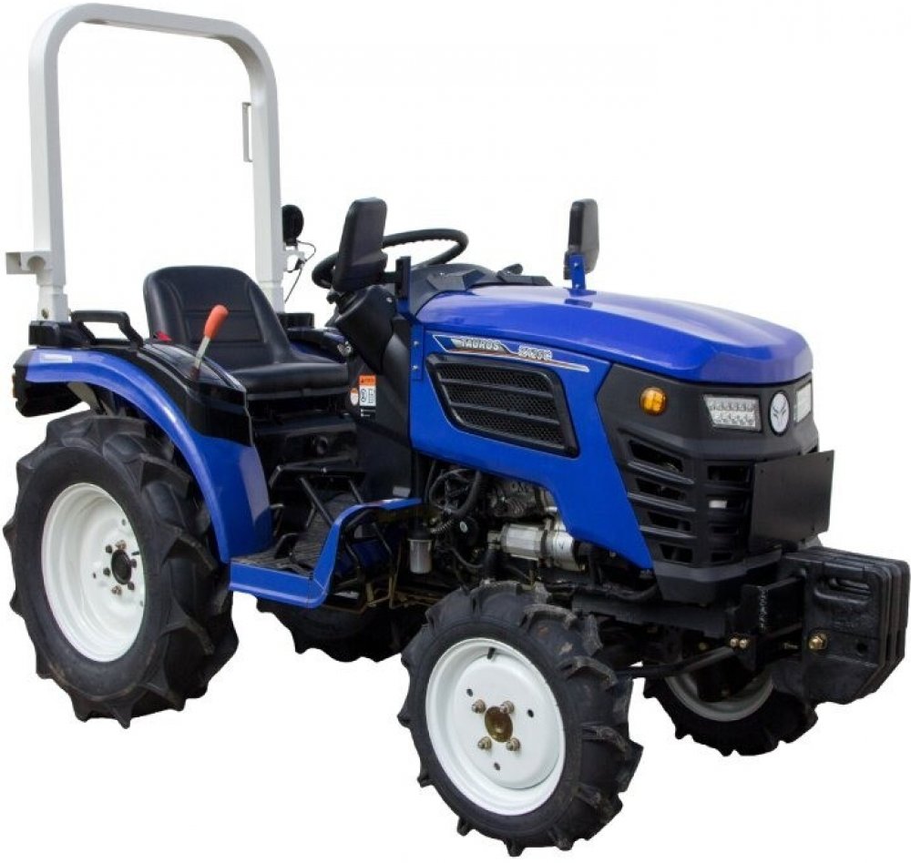 Plně vybavený malotraktor s náhonem na všechny čtyři kola, s uzávěrkou diferenciálu a ochranným rámem, a se zadní vývodovou hřídelí k připojení širokého příslušenství.