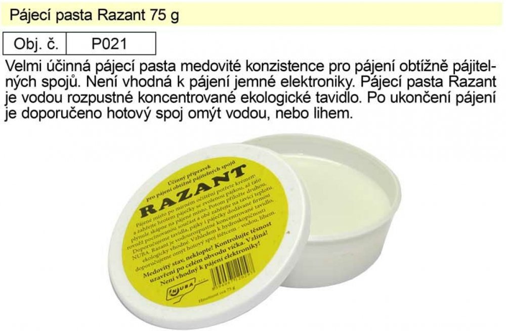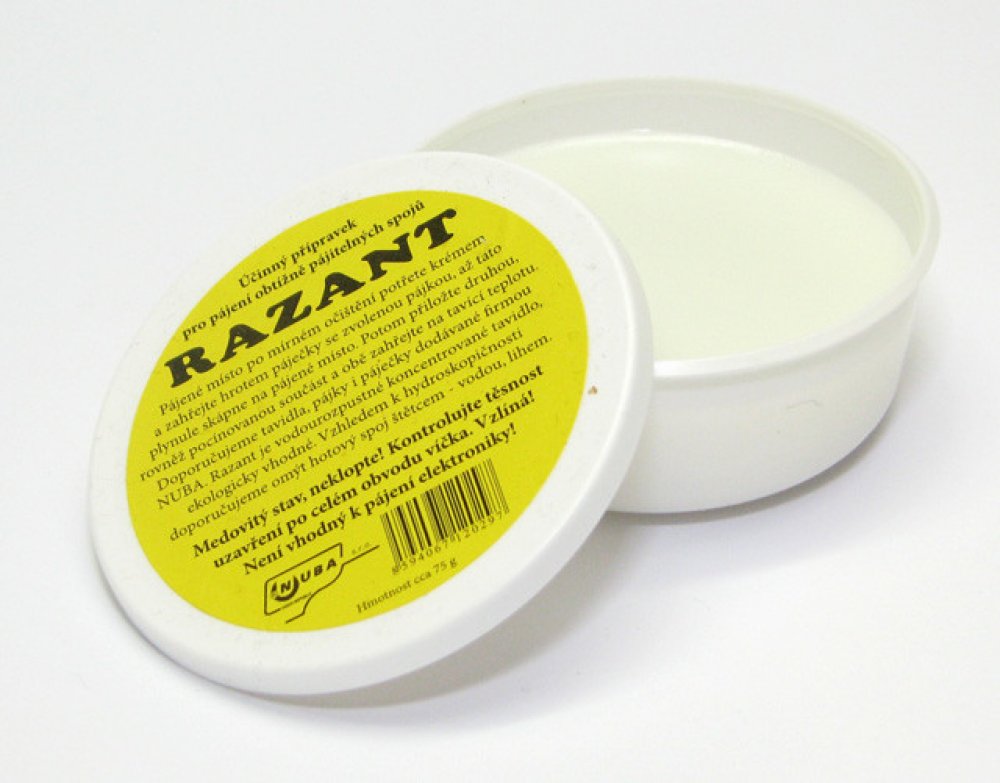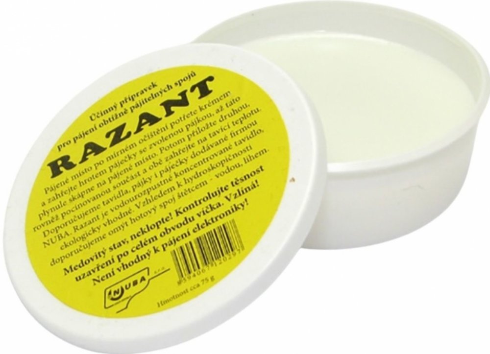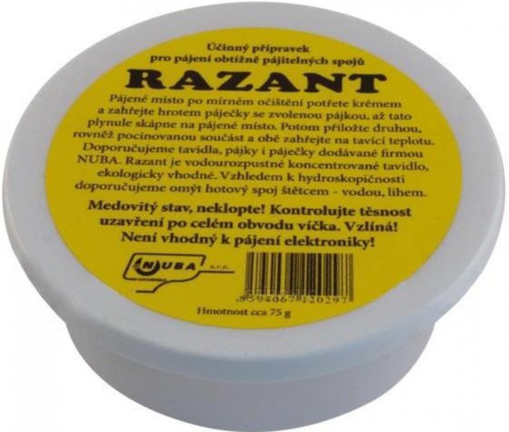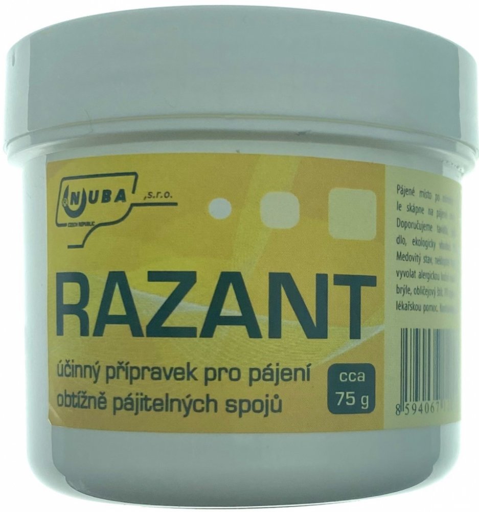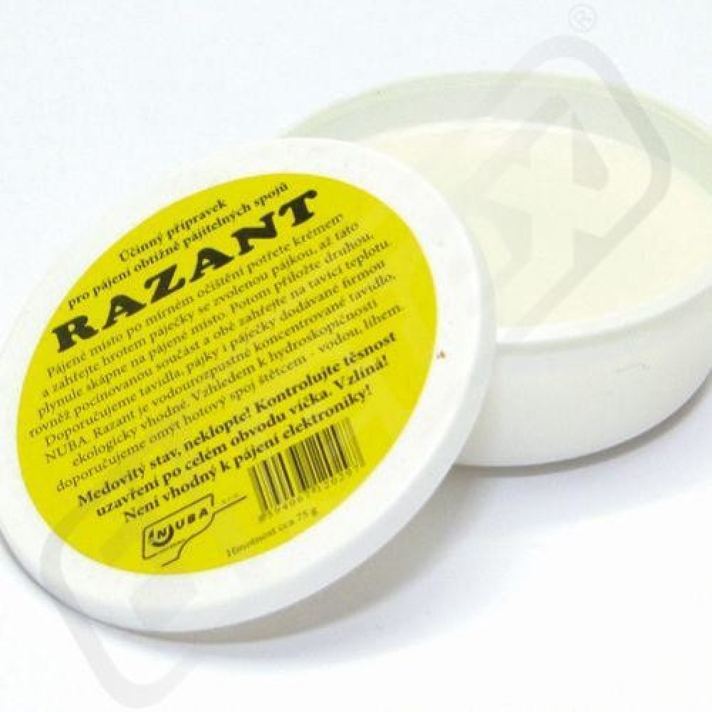 Razant je velmi účinný přípravek určený pro pájení obtížně pájitelných spojů. RAZANT je navíc vodou rozpustný, tudíž se jedná o ekologicky šetrný výrobek. Jeho použití je velmi snadné a to zejména díky "medovité" konzistenci, která usnadňuje nanášení na požadované místo.