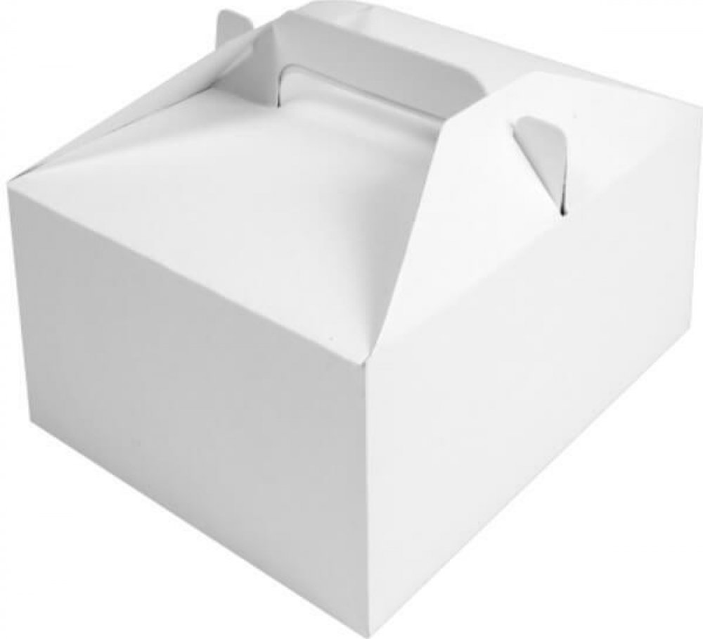 Papírová krabice na výslužku z bílo-šedé lepenky 450 g/m2. Materiál je vhodný pro přímý styk pouze se suchou nemastnou potravinou.