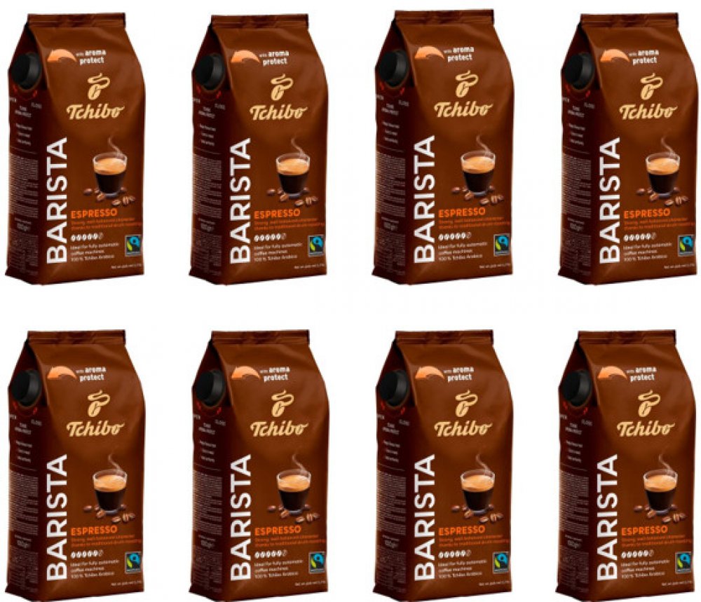 Výrazná káva s tóny hořké čokolády a oříšků se stupněm intenzity 5/5. Stejně jako další kávy Tchibo se i Barista Espresso míchá ze zrn 100% arabiky, která pocházejí z odpovědné zemědělské produkce a jsou následně zpracována pomalým pražením v bubnové pražičce.Obaly káv Tchibo Barista jsou nyní nově opratřeny speciálním uzávěrem pro zachování čerstvého aroma, ideální dávkování a snadné opětovné uzavření obalu. Kávy jsou vhodné do plnoautomatických kávovarů.Tchibo společně s Fairtrade podporuje drobné pěstitele kávy zapojené do programu Fairtrade.