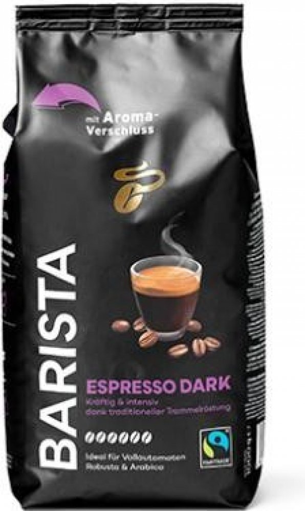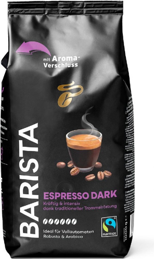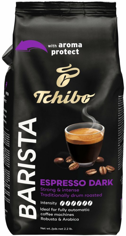 Barista Espresso Dark – zrnková káva Výrazná a intenzivní chuť s jemným tónem pražených oříšků a sametově hebkou, tmavou pěnou. Silná směs: kávová zrna z Indie a Brazílie. Charakter kávy je výsledkem pomalého pražení – díky němu mohou kávová zrna rozvinout plné, kořenité aroma a svou mimořádně aromatickou vůni. Informace o výrobku Obsah: 1 kg Intenzita: 6 z 6 Pražená zrnková káva Baleno v ochranné atmosféře. Skladujte na chladném, suchém a tmavém místě. Tchibo GmbH Überseering 18 D-22297 Hamburk, Německo Doporučení k přípravě Naše zrnkové kávy jsou ideální pro přípravu v plnoautomatickém kávovaru, ale také i v pákovém kávovaru nebo moka konvičce na espresso. Pro přípravu v pákovém kávovaru doporučujeme velmi jemné mletí, pro moka konvičku na espresso poněkud hrubší (střední) mletí. Naše espresso si můžete vychutnat buď samo o sobě, nebo jako cappuccino, latte macchiato, flat white nebo silné americano. Naopak naši kávu caffè crema si můžete připravit jako aromatickou kávu s lahodnou sametovou pěnou, jako café au lait nebo jako latte. Aroma uzávěr Tchibo Díky aroma uzávěru Tchibo zůstanou kávová zrna obzvlášť čerstvá, aroma uzávěr je chrání před světlem a vzduchem. Vychutnejte si čerstvou vůni kávových zrn při každém otevření! Už nikdy nerozsypete zrnkovou kávu – kulatý otvor uzávěru umožňuje dokonalé a přesné dávkování. Pokyny pro skladování Doby gumiček a lepicí pásky jsou dávno pryč. Aroma uzávěr Tchibo lze snadno a bezpečně znovu uzavřít. S novým aroma uzávěrem Tchibo můžete zrnkovou kávu jednoduše ponechat v obalu. Kávová zrna jsou tak ideálně chráněna a zůstávají úžasně čerstvá. Skladujte na chladném a suchém místě. Naše kávy Tchibo Barista Čím jsou naše kávy Barista tak jedinečné? Vyznačují se kávovými zrnami s certifikací 100 % Fairtrade, udržitelným původem a šetrným pomalým pražením v bubnových pražičkách. Díky praktickému aroma uzávěru zůstávají zrna obzvlášť dlouho čerstvá a zachovávají si svou nezaměnitelnou chuť. Certifikace Fairtrade Je naší povinností přispět ke zlepšení životních a pracovních podmínek rodin pěstitelů kávy. Fairtrade znamená: **splnění sociálních, ekologických a ekonomických standardů, **stabilní minimální ceny a dodatečnou prémii Fairtrade pro komunitní projekty, **zlepšení životních a pracovních podmínek.