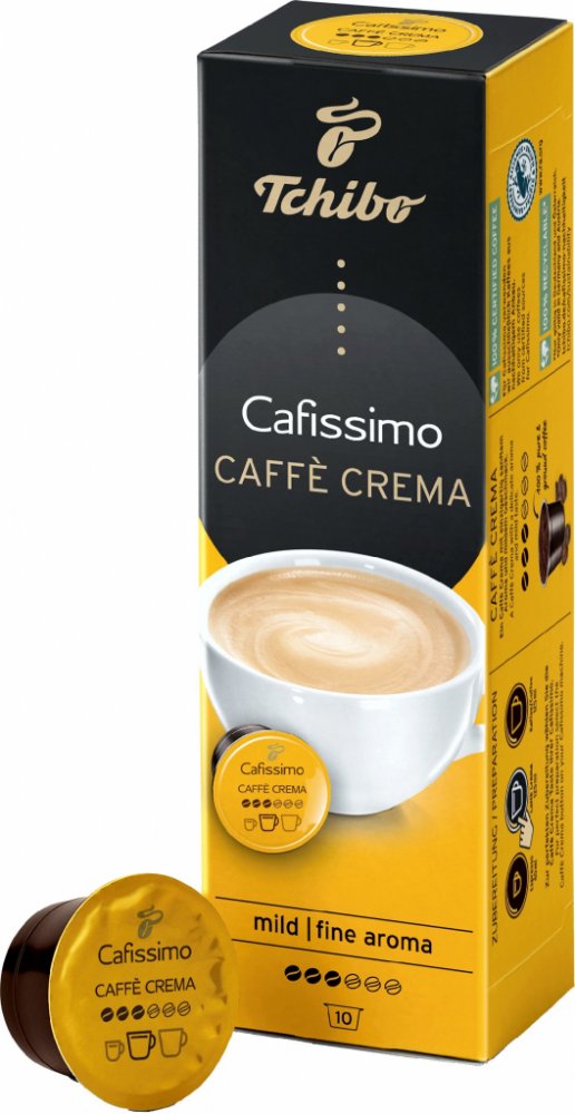 Tchibo Cafissimo Crema Fine Aroma (bývalé - Caffe Crema Mild) je jemně vypálená směs 100% arabiky. Vyznačuje se jemnou chutí a vyváženou aromatičností s ovocnými tóny. Crema Fine, korunovaná zlatou pěnou, je skvělou volbou pro ty, kteří mají rádi jemnou chuť černé kávy.
