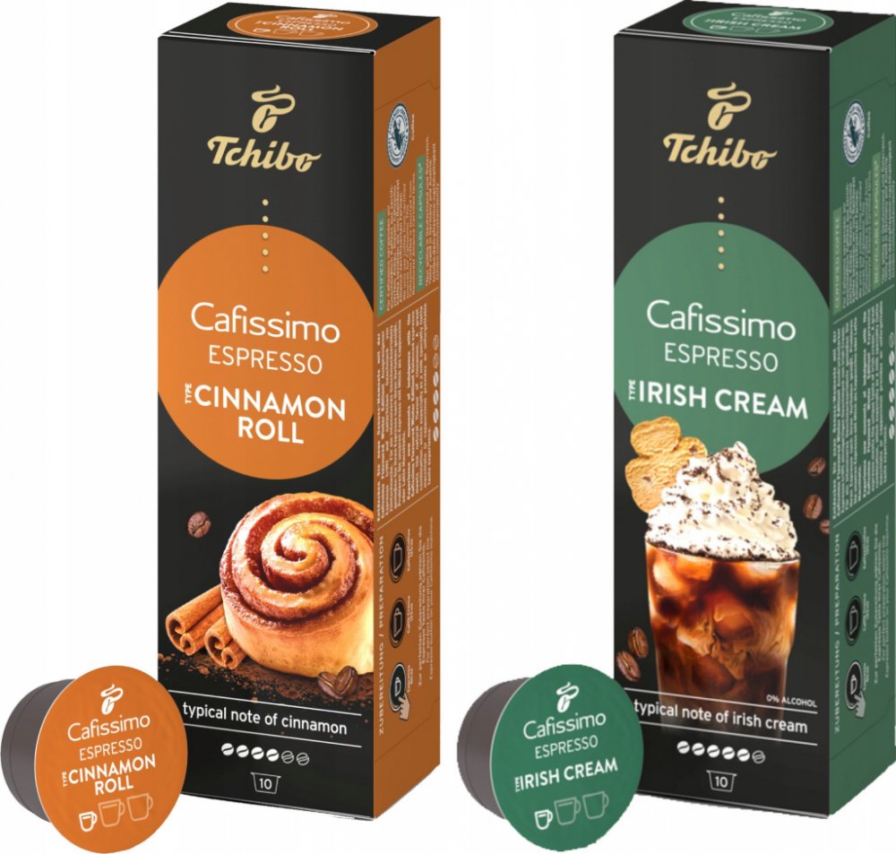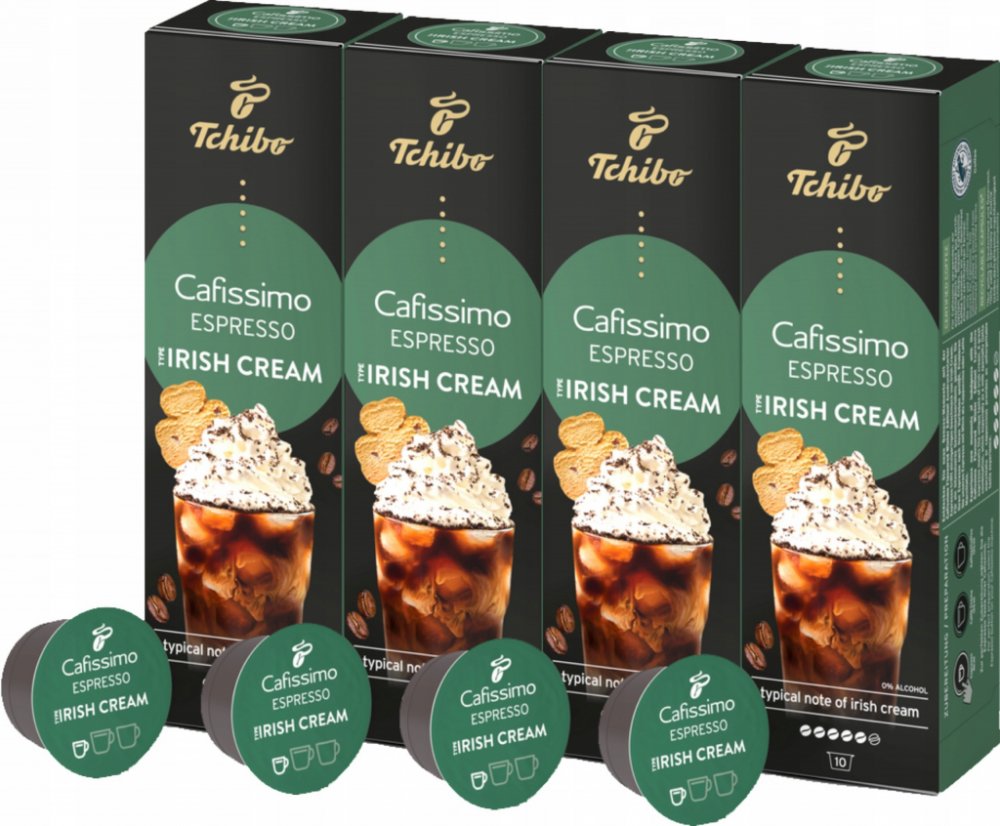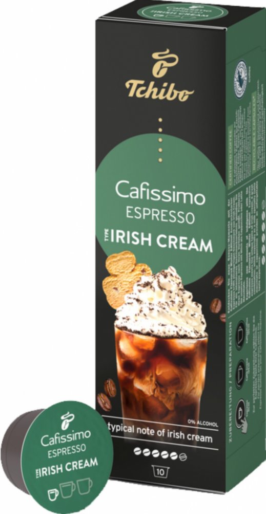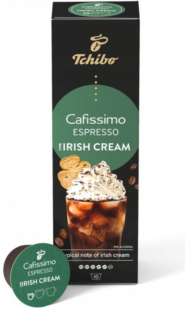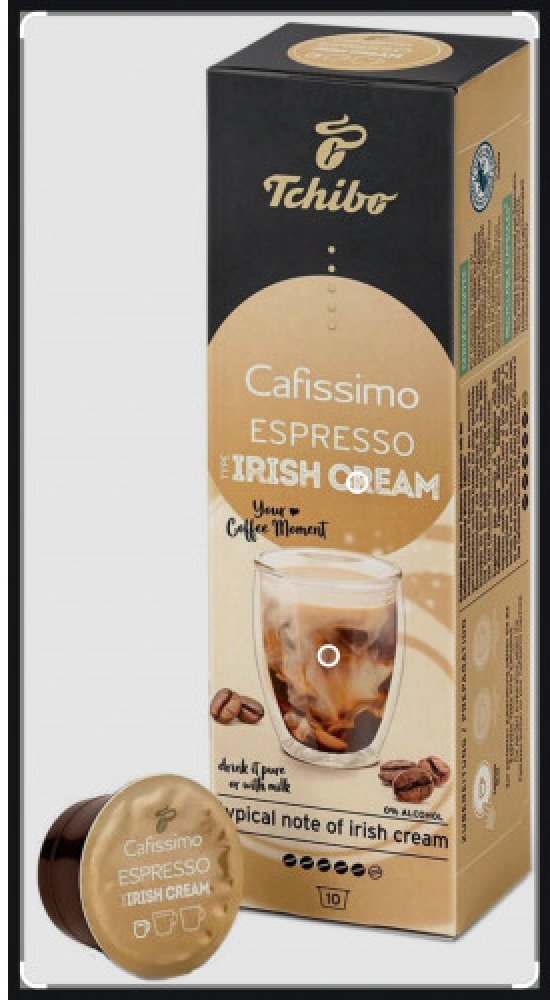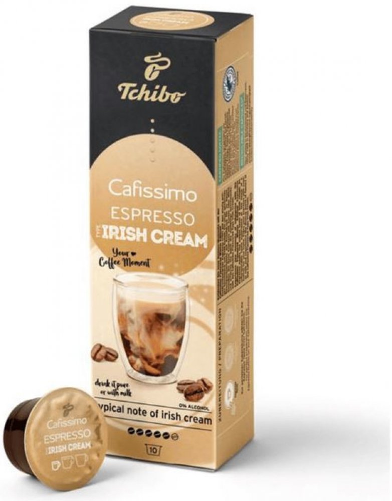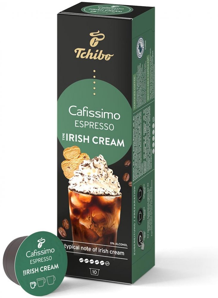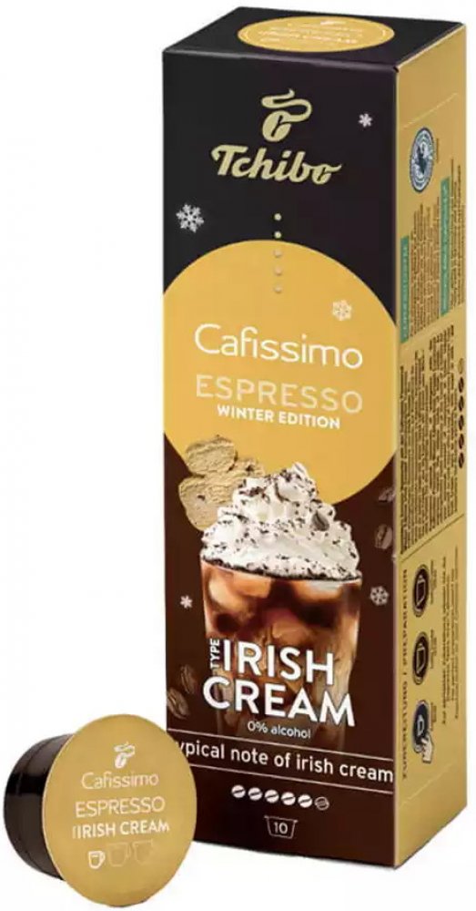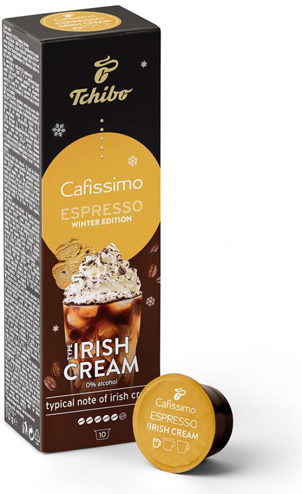 Tchibo Cafissimo Espresso Irish Cream 10 ks kapslí Chuťově výrazné espresso se snoubí s jedinečnou chutí likéru Irish Cream. Přírodní aromata, žádný cukr, žádná sladidla, žádné sušené mléko Tchibo Arabica – kávová zrna z Brazílie Certifikace Rainforest Alliance Limitovaná zimní edice: v prodeji jen na krátkou dobu