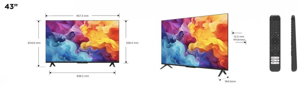 TCL 108 cm LED 43 palců Google TV 2024 Černá Stojan, napájecí kabel, manuál, baterie, záruční list, dálkový ovladač Dobré pro smíšené osvětlení TCL V6B 3840 x 2160 16 : 9 60 1.5-2.0m optimální Standardní podpora HDR Starší platforma (může zpomalovat) 4K HDR streaming připraveno 3 1 3 porty 45.0 W F 65 kWh 45 kWh F 1831038 ~€15/rok typické použití Snadná montáž (standardní VESA) 6.4 kg 200 x 200 Vyžaduje 105cm+ nábytek 55,8 × 95,7 × 8 cm Dobrý vestavěný zvuk