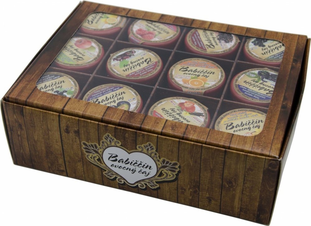 Dárková variace tradičních čajů dle receptůr našich babiček. Skvělý dárek, který zachutná i potěší.Obsah kolekce:Mix 12 kusů čajů 60mlPříprava:- horká varianta nápoje: při zalití 200ml horké vody získáte vonný aromatizovaný čaj plný kousků ovoce.- studená varianta nápoje: při zalití 200ml studené vody získáte velmi osvěžující ovocný nápoj s kousky ovoce. Možno doplnit ledem či ledovou tříští.Objem:12x 60ml