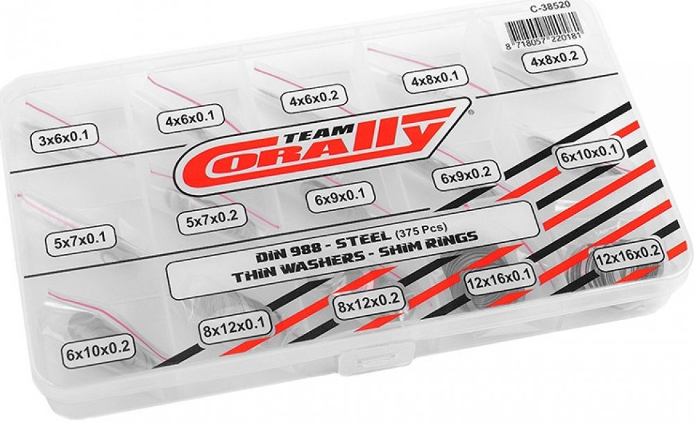 Team Corally Podložky sada/box 3 až 12 mm ocelové 375 ks
