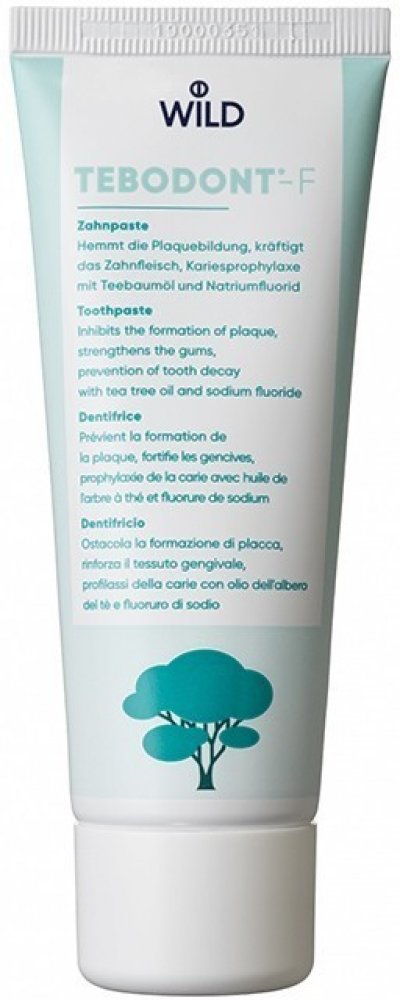TEBODONT -F zubní pasta s fluoridy, 75 ml Zubní pasta s čajovníkovým olejem a fluoridy pro léčbu chronického zánětu dásní a parodontózy. Posiluje dásně, nebarví zuby a zanechává v ústech dlouhotrvající svěží pocit.