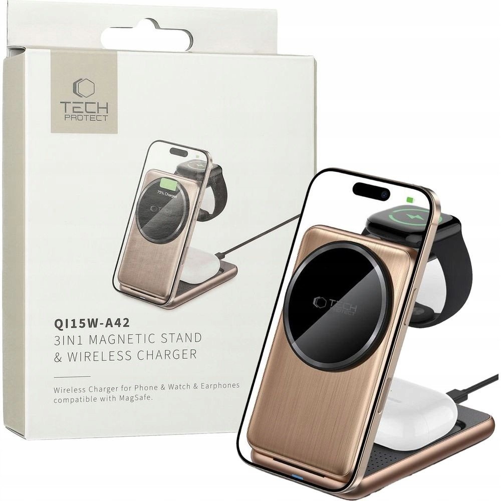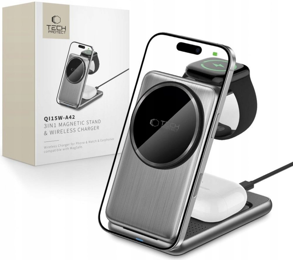 Bezdrátová nabíječka pro iPhone, AirPods a Apple Watch Tech-Protect QI15W-A42 přinese do vašeho každodenního života pohodlí, styl a praktičnost. Toto zařízení je plně kompatibilní s technologií MagSafe, což zajišťuje dokonalé uchycení a stabilní nabíjení pro Apple zařízení. S podporou standardu Qi nabízí rychlé nabíjení pro smartphony (5W, 7,5W, 10W, až 15W), sluchátka TWS (5W) a hodinky (2,5W).