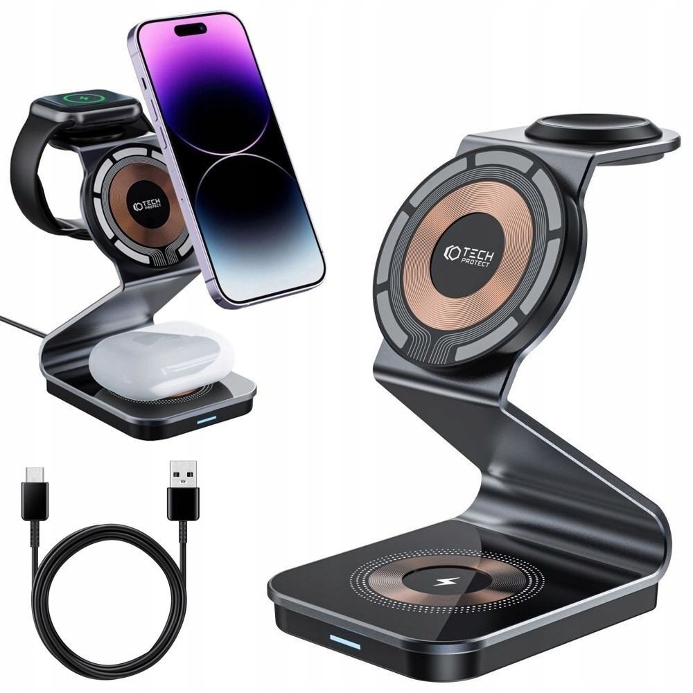 Tech-Protect QI15W-A29 je univerzální nabíječka 3 v 1, která přináší pohodlí a spoustu funkcí. Tato nabíječka vyniká tím, že dokáže napájet až tři zařízení současně, což vám umožňuje udržet vaše chytré telefony, Apple Watch a bezdrátová sluchátka, jako jsou Apple AirPods nebo Samsung Galaxy Buds, plně nabitá a připravená k použití.