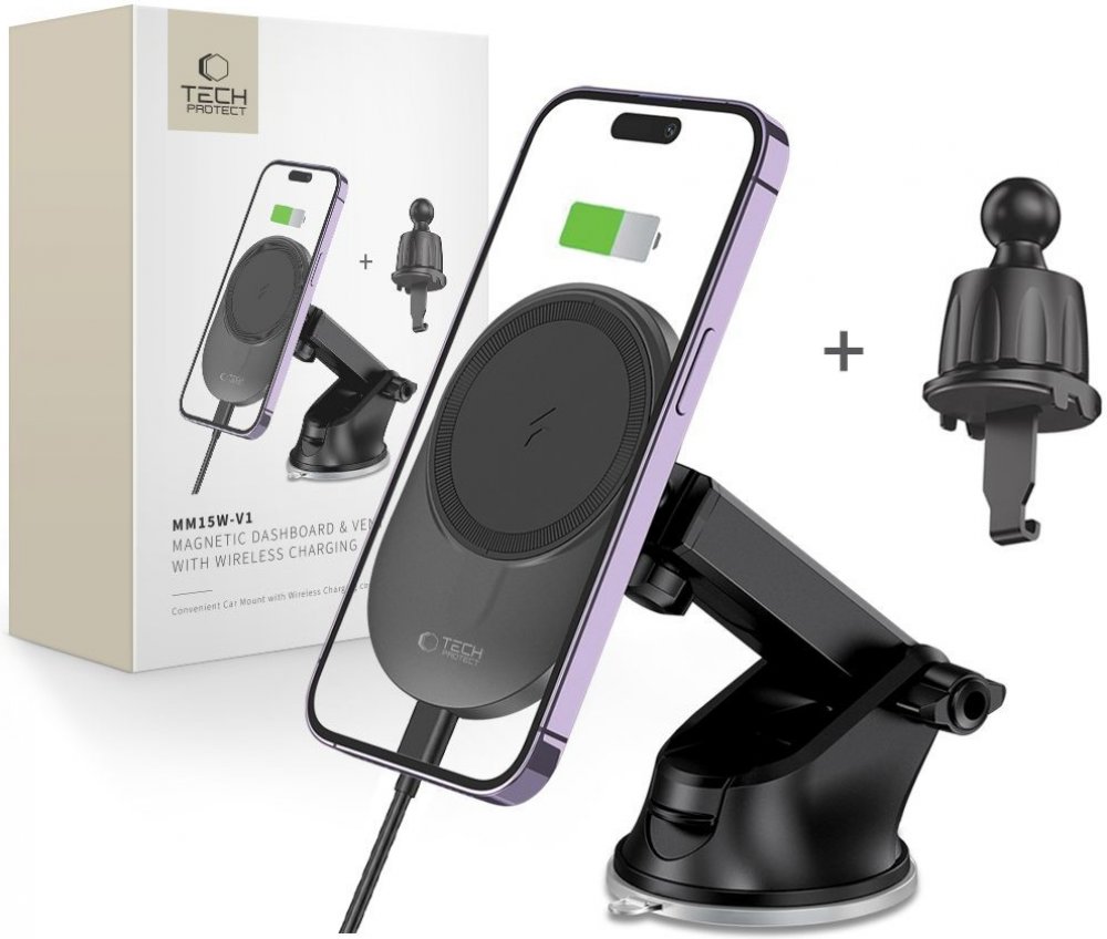 Tech-Protect TECH-PROTECT MM15W-V1 MAGNETICKÁ BEZDRÁTOVÁ NABÍJEČKA DO AUTOMOBILU S MAGSAFE, DO PŘÍSTROJOVÉ DESKY A VENTILAČNÍHO SYSTÉMU, 15 W, ČERNÁ