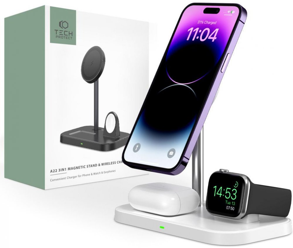 Minimalizujte počet potřebného nabíjecího příslušenství na minimum díky funkční nabíjecí stanici A22 značky Tech-Protect. Tento chytrý gadget vám umožní obnovit energii ve všech chytrých telefonech s technologií Magsafe, bezdrátových sluchátkách Apple Airpods a chytrých hodinkách Apple.