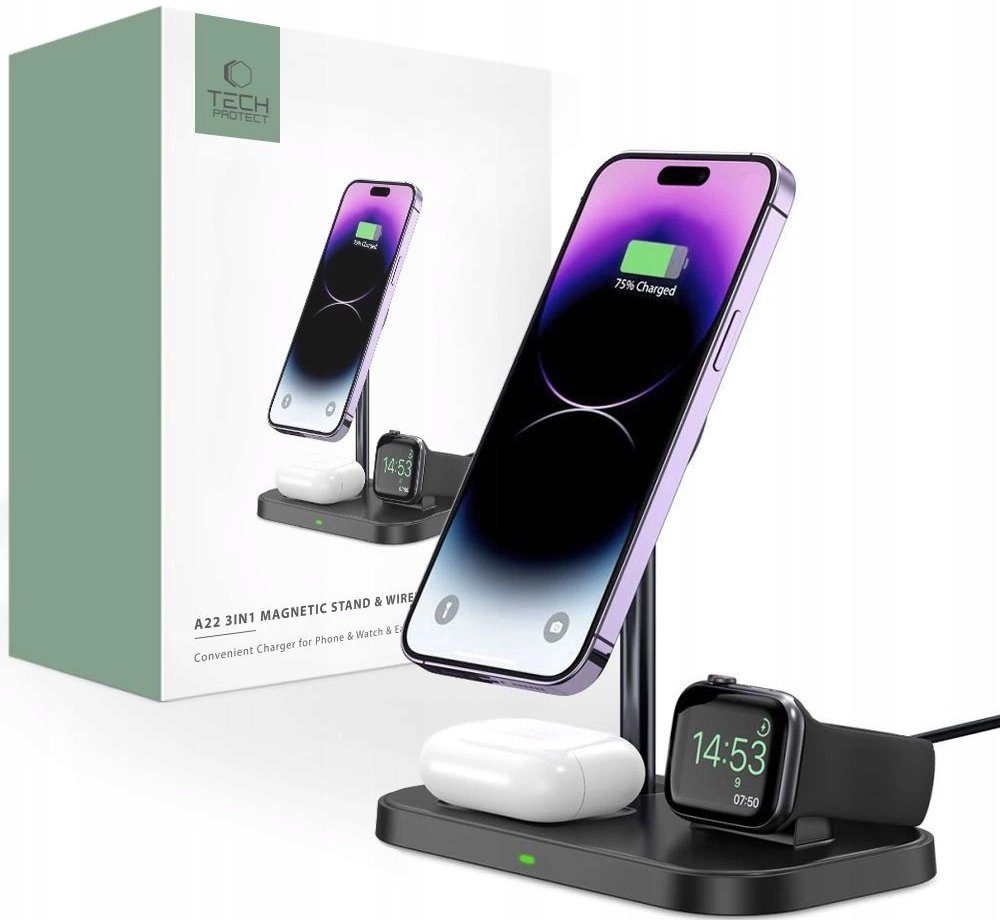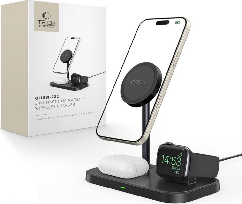 Bezdrátová nabíječka 3v1 je inteligentní zařízení určené pro současné nabíjení až tří zařízení - telefon s podporou bezdrátového nabíjení, Airpods a Apple Watch. Vaše Apple zařízení tak můžete nabíjet pohodlně a hlavně bez zbytečných kabelů, které máte pro každé zařízení zvlášť. Design je modulární, takže vaše zařízení můžete nabíjet v různých konfiguracích. V případě, že váš telefon nepodporuje bezdrátové nabíjení, můžete použít adaptér pro bezdrátové nabíjení, který umístíte pod pouzdro. Jednoduchý estetický design s protiskluzovou úpravou na spodní straně se bude skvěle hodit v práci i doma a díky malým rozměrům si rychle získá své vyhrazené místo. Ochranný systém chrání připojená zařízení před přehřátím a přepětím, přičemž během nabíjení udržuje konstantně nízkou teplotu. Proto je i ponechání zařízení na nabíječce několik hodin naprosto bezpečné. * Abyste naplno využili potenciál indukční nabíječky, doporučujeme ji připojit k síťové nabíječce s výstupním výkonem 25W (V*A) a více. * Magnetická funkce MagSafe funguje pouze přímo na telefonu nebo na pouzdře se zabudovaným magnetickým očkem s funkcí MagSafe. Parametry:- Kompatibilní se systémem MagSafe - Vstupní proud USB-C: 9V/3A, 12V/2,25A - Výstupní výkon chytrého telefonu: 15W/10W/7,5W/5W - Výstupní výkon hodinek: 3W - Výstupní výkon sluchátek: 5W - Modulární design - Funkce napájení tří zařízení současně - Funkce napájení každého zařízení samostatně - Obsah balení: nabíječka, kabel USB-C 1m
