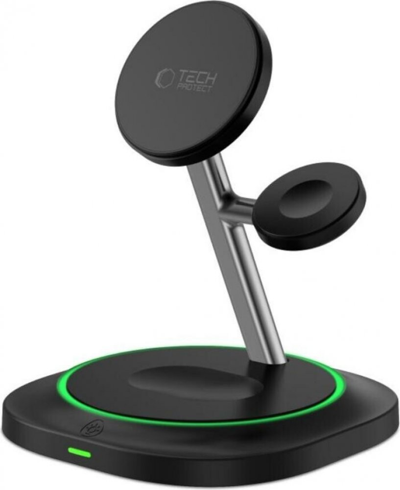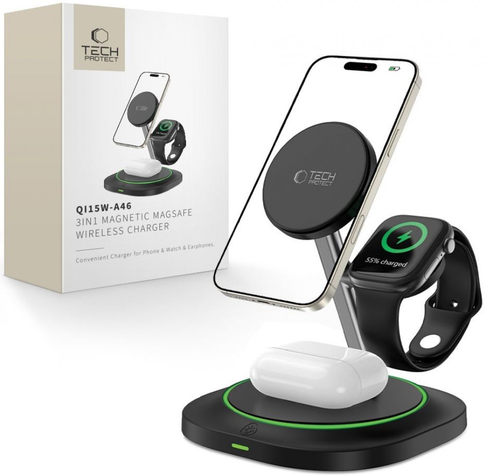 Tech-Protect QI15W-A46 - nejmodernější magnetická bezdrátová nabíječka 3 v 1 vytvořená pro uživatele, kteří si cení pohodlí a estetiky. Díky podpoře technologie MagSafe a možnosti nabíjet tři zařízení současně je ideální do kanceláře, ložnice nebo obývacího pokoje. Nabíječka podporuje rychlé nabíjení až 15 W pro smartphony, 2,5 W pro chytré hodinky a 3 W pro sluchátka, přičemž kompatibilita s prot...