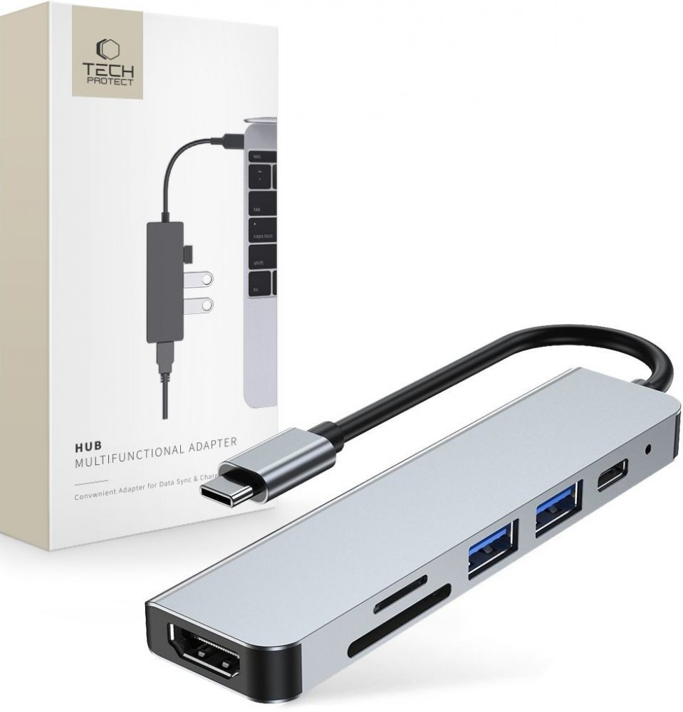 Multifunkční zařízení 6 v 1 od společnosti Tech-Protect určené pro všechny notebooky se vstupem USB Type-C. Kompaktní adaptér umožňuje nabíjet a synchronizovat data mnoha zařízení současně.