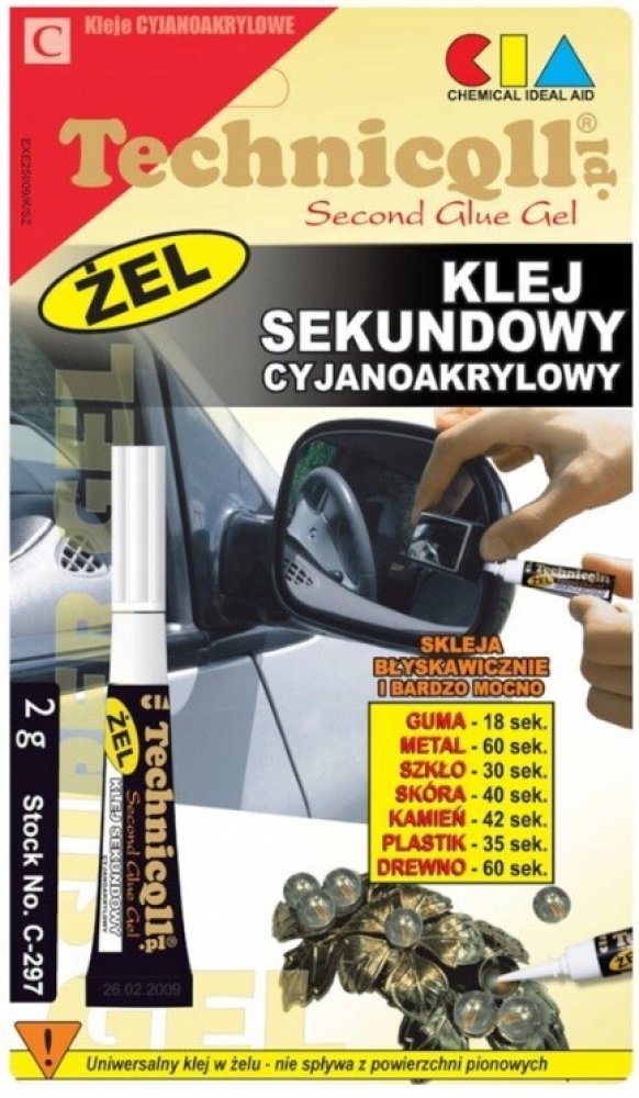 Sekundové lepidlo Technicqll C-297 používané na velmi kvalitní lepení téměř všech možných materiálů.Univerzální finančně nenáročné sekundové lepidlo pro opětovné použití.Určeno pro lepení: kovu, pryže, dřeva, keramiky, cementu, tvrdých plastů, skla, kůže, překližky, hliníku atd. (kromě PE, PP a teflonu). Lepí k sobě tvrdé a pružné materiály. Používá se také pro lepení kombinací kovů "kov + pryž, plasty + pryž, papír + překližka + sklo atd."Návod k použití:Odmastěte povrch (P-102 nebo P-959 technický odmašťovač).Povrchy by měly být čisté a zbavené nečistot.Naneste tenkou rovnoměrnou vrstvu lepidla na jeden z povrchů (čím méně lepidla, tím pevnější spoj).Ihned přiložte prvky k sobě, stiskněte a podržte na několik sekund.