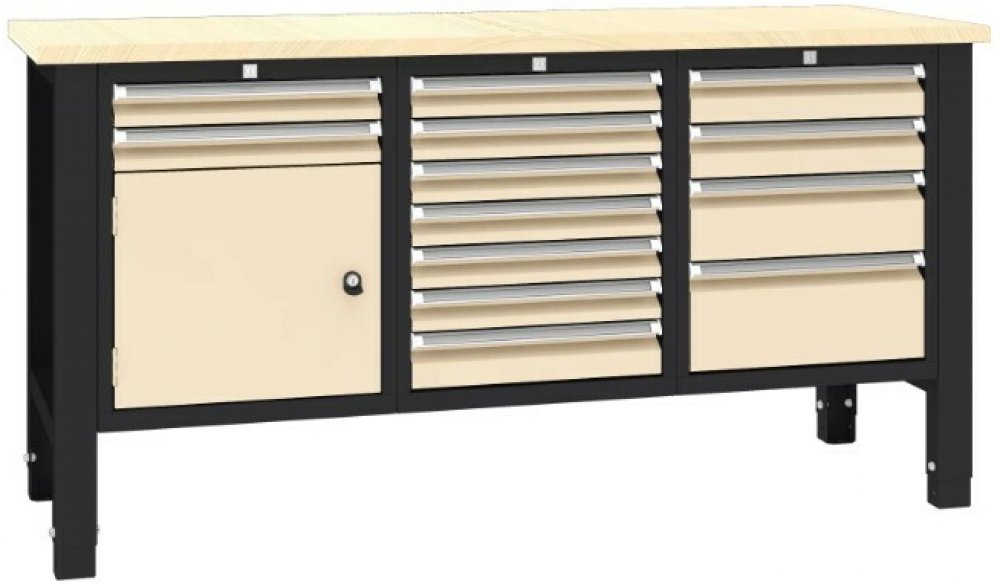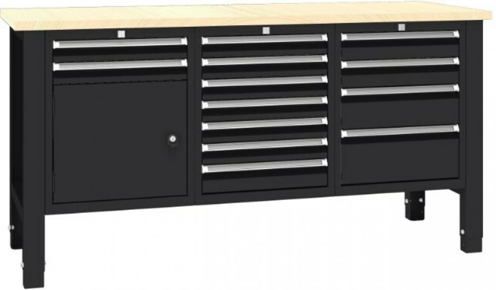 ✔ Stabilní konstrukce s výškově nastavitelnými nohami (850 nebo 900 mm). ✔ Pracovní deska z lakované překližky z tvrdého dřeva o tloušťce 30 mm (multiplex). ✔ Až 13 zásuvek a 1 skříňka pro efektivní uspořádání nářadí. ✔ Centrální zamykání pro vyšší bezpečnost uložených předmětů. ✔ Barevné provedení: kombinace dle palety RAL ✔ Testováno dle norem kvality ISO 9001 a ISO 14001. ✔ Dodáváno v rozloženém stavu, snadná montáž podle návodu