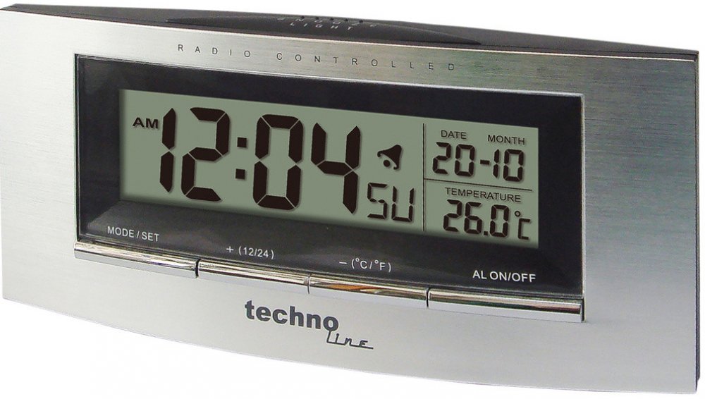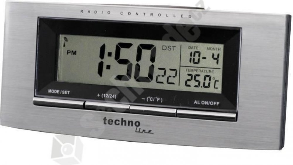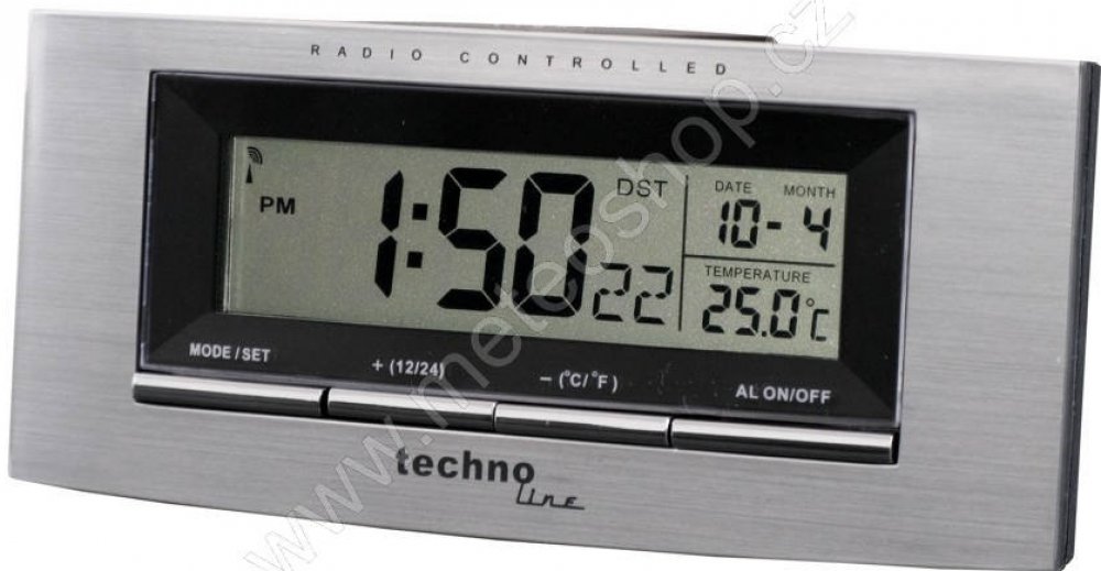 - displej o rozměrech 83 x 22 mm - možnost krátkodobého podsvícení displeje na 5 sekund zelenými LED diodami- čas řízený rádiovým signálem DCF-77- 12/24 hodinový formát- budík s opakovaným buzením po 8 minutách- časová zóna (+12/-12 hodin)- datum, zkratka názvu dne- měření vnitřní teploty- napájení bateriemi 2 ks 1,5 V typ AA (tužkové)- rozměry 140 x 35 x 63 mm- barva stříbrná