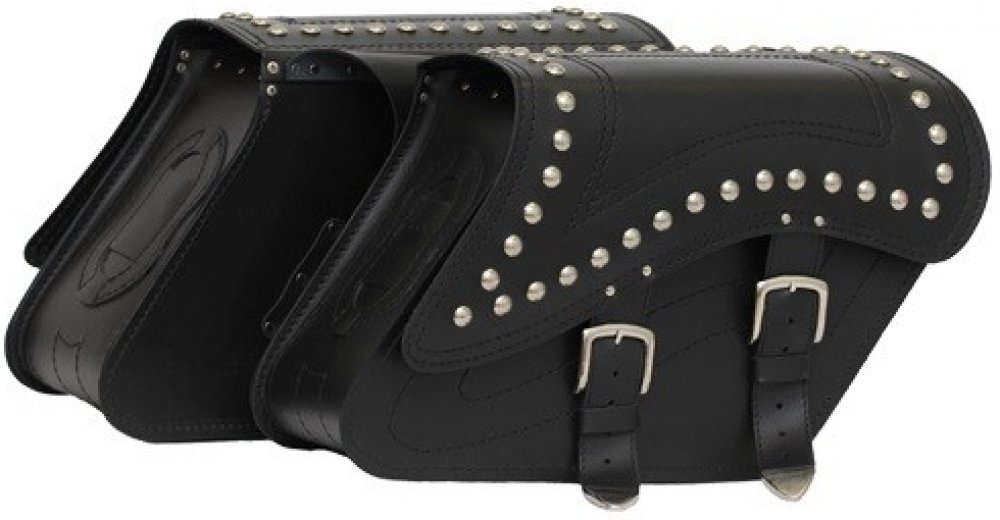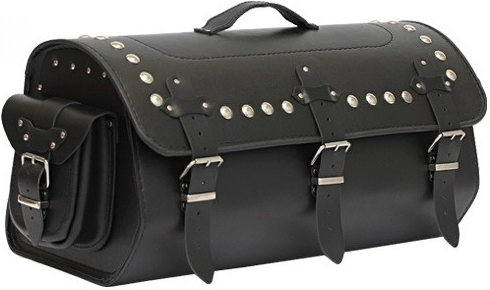 Moto válec KOSSO s cvočky Kožený moto válec z kvalitní hovězí kůže 1,8 mm Válec je vybaven vnitřními plastovými výztužemi o síle 2 mm Vhodný pro upevnění na nosič motocyklu Dvě praktické boční brašničky na řemínky v ceně Válec vyroben se zkošenou přední a zadní stranou Objem: 45 l Rozměry: délka 60 cm, výška 29 cm, šířka 26 cm