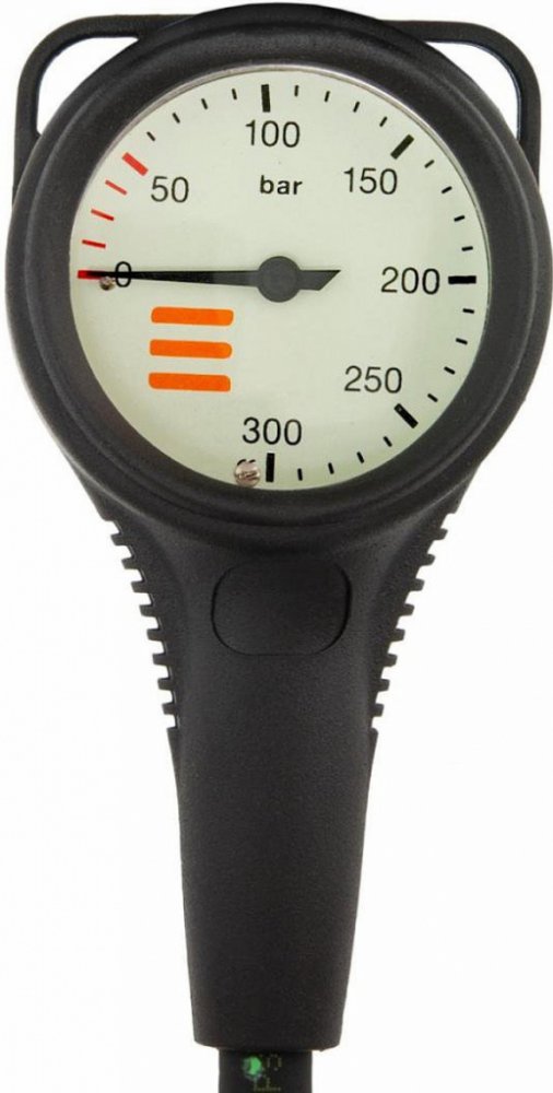Manometr pro potápěče má chromované mosazné pouzdro s krytem z plastu.