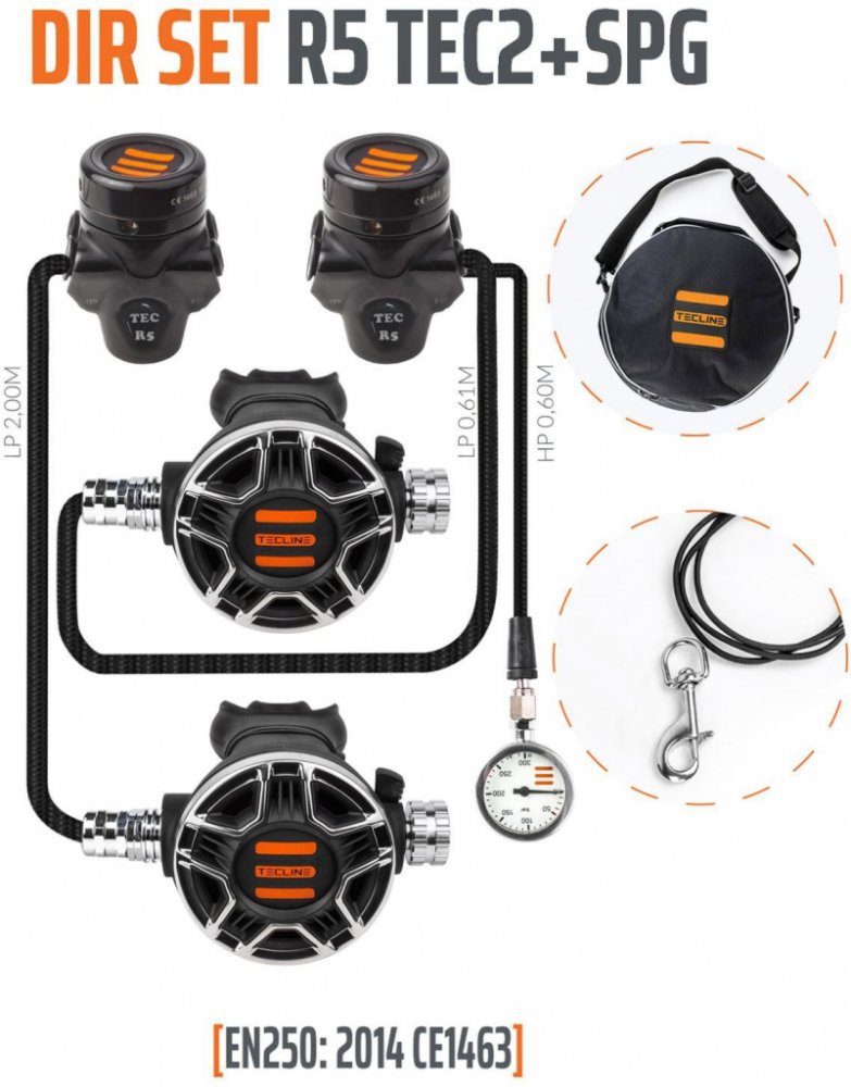 R5 TEC2 DIR set EN250:2014 je špičkovým setem pro twin. 1.st. - R5 TEC: - EN 250: 2014 certifikace: hodnocení světově nejvyšší kvality SCUBA regulátorů - membránově vyvážený 1. stupeň se suchou komorou, která zajišťuje zvýšenou odolnost proti zamrzání, a cold kit - 4x LP port, 2x HP port - maximální pracovní tlak 300 bar - materiál: námořní bronz - hmotnost: 810 g 2.st. - TEC2: - inovatívní konstrukce: komfortnější dýchání - minimalistický dizajn: spolehlivost ve všech podmínkách, nenáročná údržba - odolný materiál: odolnost vůči teplotným, mechanickým i chemickým činitelům - EN 250: 2014 certifikace: hodnocení světově nejvyšší kvality pro scuba regulátory - vyvážený 2. stupe ň - regulace Venturiho efektu a nádechového odporu - DFS: systém přímého toku - tělo vyrobeno z materiálu odolného vůči vysokým teplotným změnám - vnější ochranní prstenec z nerezové oceli - teflonová vrstva na všech kovových částech - doplnkový tepelní výměník pro studené vody - ergonomický náustek - hmotnost: 260 g LP hadice 0,61m Proflex, LP 1,93m Proflex, HP XTR 0,60m karabina nerez 88mm, bungee, oranžová nylonová šnůrka. Manometr Tecline 300 bar. Automatika dodávána v kruhové tašce na automatiku Tecline.