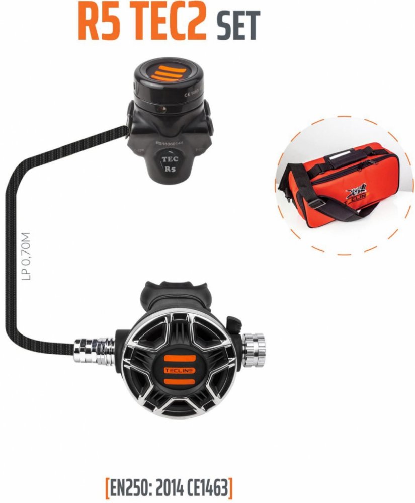 Regulátor je určen pro nejnáročnější potápěče do studené vody. 1.st. - R5 TEC: - EN 250: 2014 certifikace: hodnocení světově nejvyšší kvality SCUBA regulátorů - membránově vyvážený 1. stupeň se suchou komorou, která zajišťuje zvýšenou odolnost proti zamrzání, a cold kit - 4x LP port, 2x HP port - maximální pracovní tlak 300 bar - materiál: námořní bronz - hmotnost: 810 g 2.st. - TEC2: - inovatívní konstrukce: komfortnější dýchání - minimalistický dizajn: spolehlivost ve všech podmínkách, nenáročná údržba - odolný materiál: odolnost vůči teplotným, mechanickým i chemickým činitelům - EN 250: 2014 certifikace: hodnocení světově nejvyšší kvality pro scuba regulátory - vyvážený 2. stupe ň - regulace Venturiho efektu a nádechového odporu - DFS: systém přímého toku - tělo vyrobeno z materiálu odolného vůči vysokým teplotným změnám - vnější ochranní prstenec z nerezové oceli - teflonová vrstva na všech kovových částech - doplnkový tepelní výměník pro studené vody - ergonomický náustek - hmotnost: 260 g LP hadice 0,70m Proflex Set vhodný k použití s nitroxem do 40%. Automatika dodávána v červené tašce na automatiku Tecline .
