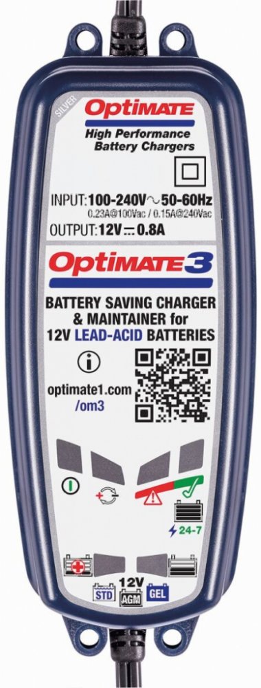 Vhodné pro akumulátory o kapacitě 2 až 35Ah. Tato nabíječka je určena pro běžného uživatele, který si potrpí na prvotřídní kvalitu a pohodlí. Optimate 3 dokáže nejen baterii nabít, ale i oživit hluboko vybité akumulátory, otestovat stav baterie a udržovat ji trvale v nabitém stavu. Optimate 3 může být trvale připojen k akumulátoru. Pravidelným nabíjením minimalizujete poškození Vašeho akumulátoru sulfatací, hlavně v zimním období, kdy není baterie v provozu.