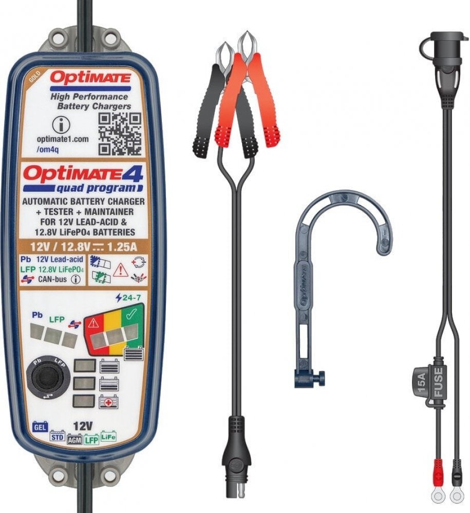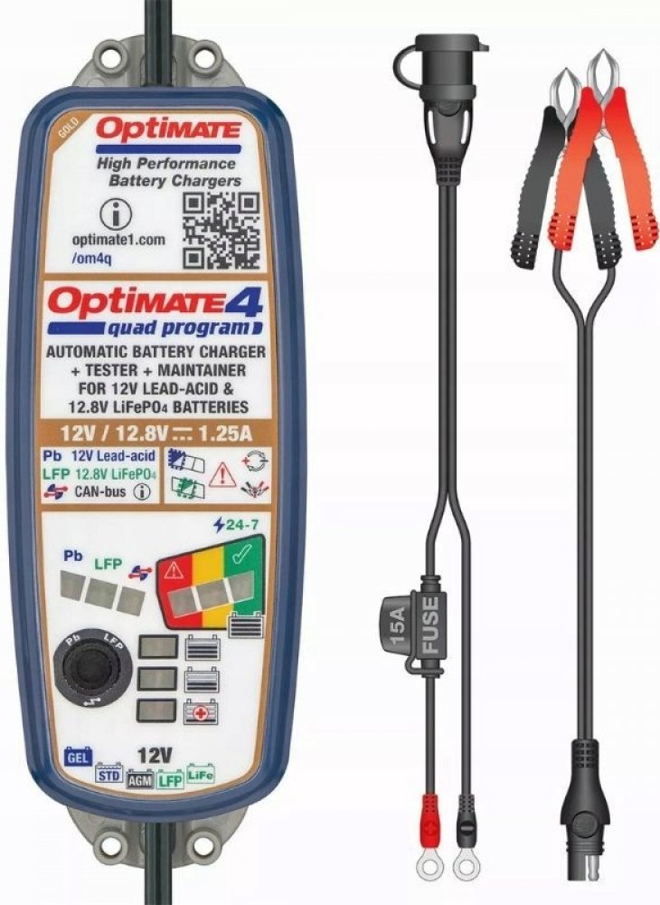 OPTIMATE 4 QUAD je inovativní 9stupňová nabíječka a zařízení pro napájení akumulátorů 12 V / 12,8 V, určené pro motocykly typu adventure, turistické, cruiser, vysoce výkonné motocykly, vozidla ATV, Side by Side a vodní skútry. Jedná se o nejmodernější řešení v oblasti nabíjení baterií ve sportovních vozidlech. OPTIMATE 4 QUAD je ideální pro olověné akumulátory 12 V a lithiové akumulátory LFP (LiFePO4) 12,8 V / 13,2 V a nabízí automatické nabíjení do plného nabití bez nutnosti dozoru.