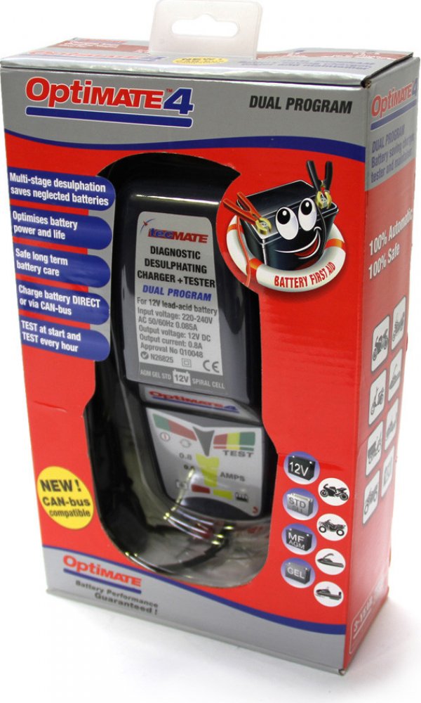 OptiMate 4 Dual Program CAN-bus Edition nabízí dva nabíjecí programy: program 1 slouží k přímému nabíjení baterie, program 2 umožňuje bezpečné bezobslužné nabíjení prostřednictvím 12V zásuvky motocyklu BMW řízené sběrnicí CAN-bus.
