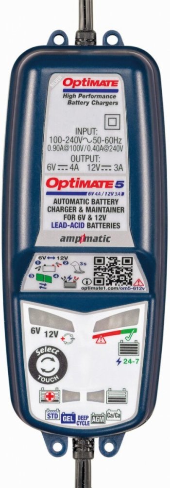 Optimate 5 6V/12V-4A/2,8A automatická nabíječka. Výrobce TECMATE. Nabíječka slouží pro nabíjení olověných bezúdržbových, Super MF, VRLA i záložních akumulátorů o kapacitě 8Ah až 192Ah. Tato profesionální nabíječka není určena jen pro servisy, ale i pro běžného uživatele, který si potrpí na prvotřídní kvalitu a pohodlí. Optimate 5 dokáže nejen baterii nabít, ale i oživit hluboko vybité akumulátory,...