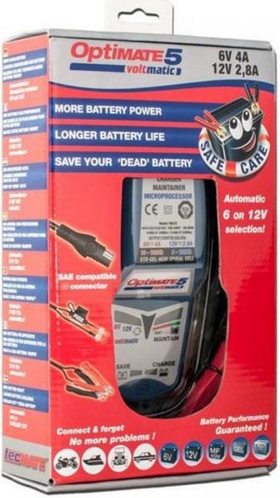 OptiMate 5 voltmatic, ideální prostředek pro domácí údržbu akumulátorů s automatickým výběrem 6V - 12V. První nabíječka pro více stavové desulfatační oživení pro 6V akumulátory. OptiMate 5 voltmatic vše vykonává plně automaticky při 100% bezpečnosti a snadném použití charakteristik. Od roku 1995 se vyrobilo okolo 2 milionů OptiMate, ale až nyní s maximálním nabíjecím proudem 2,8A (12V) a 4A (6V) pro údržbu středních až velkých akumulátorů.