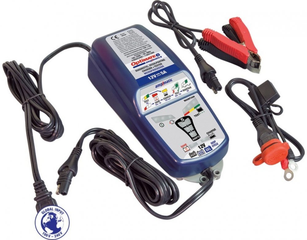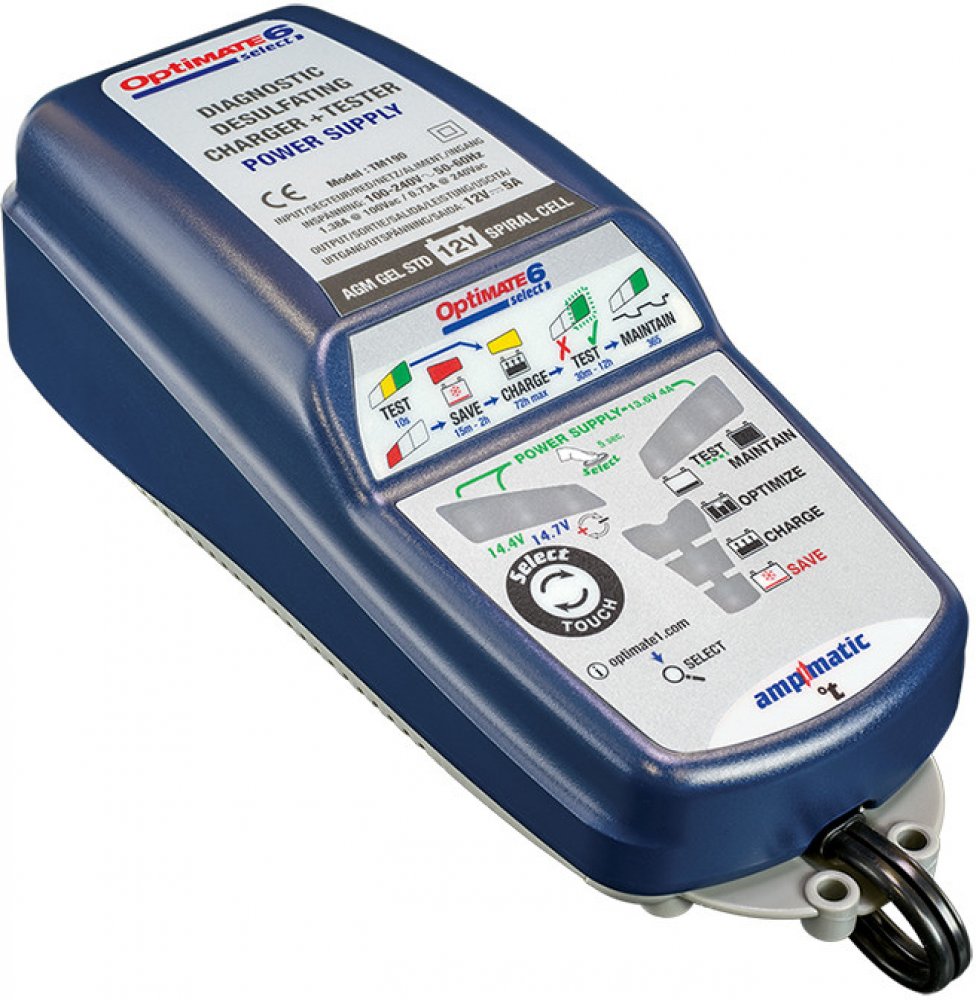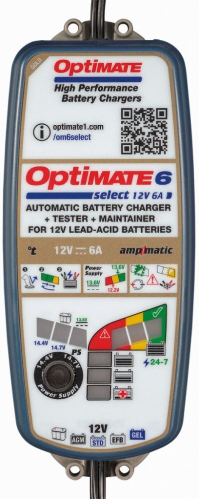 Optimate 6 Select je 12V-5A automatická nabíječka. Výrobce TECMATE. Nabíječka slouží pro nabíjení olověných bezúdržbových, Super MF, VRLA, trakčních/cyklických i záložních akumulátorů o kapacitě 3 až 240Ah.