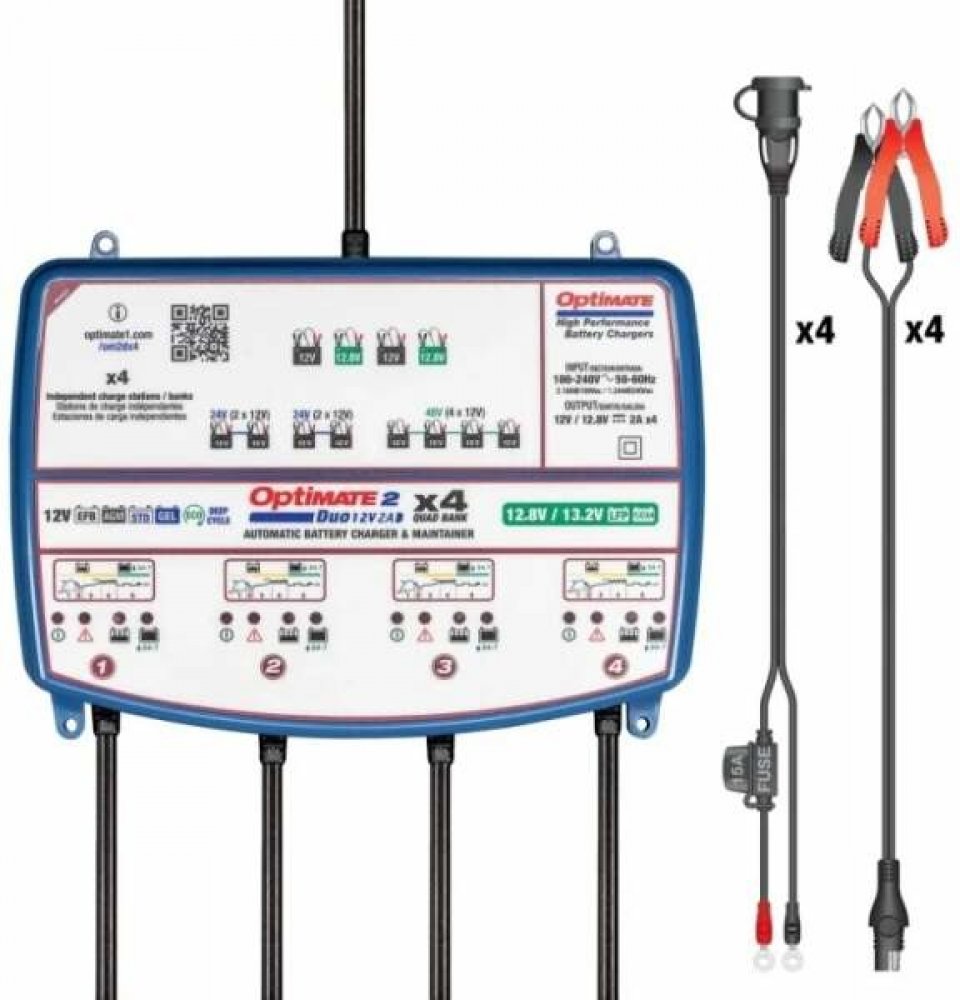 OPTIMATE 2 DUO x 4 Bank (12V/2A) TM574 je automatická nabíječka, resp. čtyři samostatné nabíječky v jedné. Výrobcem je firma TECMATE. Nabíječka slouží pro nabíjení klasických olověných, olověných bezúdržbových, AGM, gelových i lithiových (LiFePO4) akumulátorů.