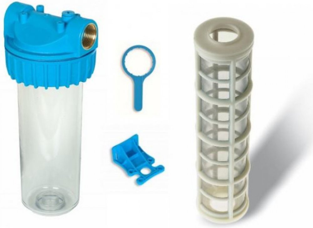 Vlastnosti Pro průtok do cca 3500 l/h. Velikosti filtru 10" Kompetní sada obsahuje i montážní klíč pro snadné povolení a utažení převlečné matice filtru při čištění vložky, držák filtru pro montáž na stěnu a vymývatelnou vložku 10" s nerezovou síťkou. Filtrační vložka Filtrační vložka vymývatelná se síťkou z nerezové oceli (100u - 0,1mm) Parametry Nádoba filtru Polypropylen Připojovací závity Rp 1...