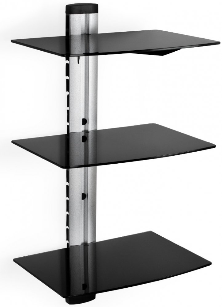 Designová nástěnná police společnosti tectake pro umístění televize, audia nebo videorekordéru, počítačové obrazovky apod. Skládá se z nástěnného držáku, ve kterém lze ukrýt všechny kabely desek z černého bezpečnostního skla. Každá deska může být zatížena max. 14 kg.