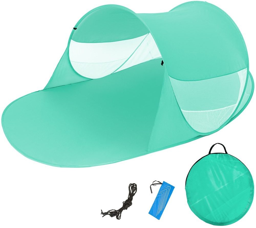Tento šikovný plážový stan s pop-up funkcí a ochranou proti UV záření je ideálním společníkem pro letní radovánky. Slouží jako ochrana před sluncem, větrem i jako ochrana zraku. Díky funkci Pop Up stan na pláži rozložíte během několika sekund - stačí ho vyhodit do vzduchu a je to! Integrované sklolaminátové tyčky udržují stan po celou dobu napnutý dle potřeby. Na obou stranách najdete odkládací pr...