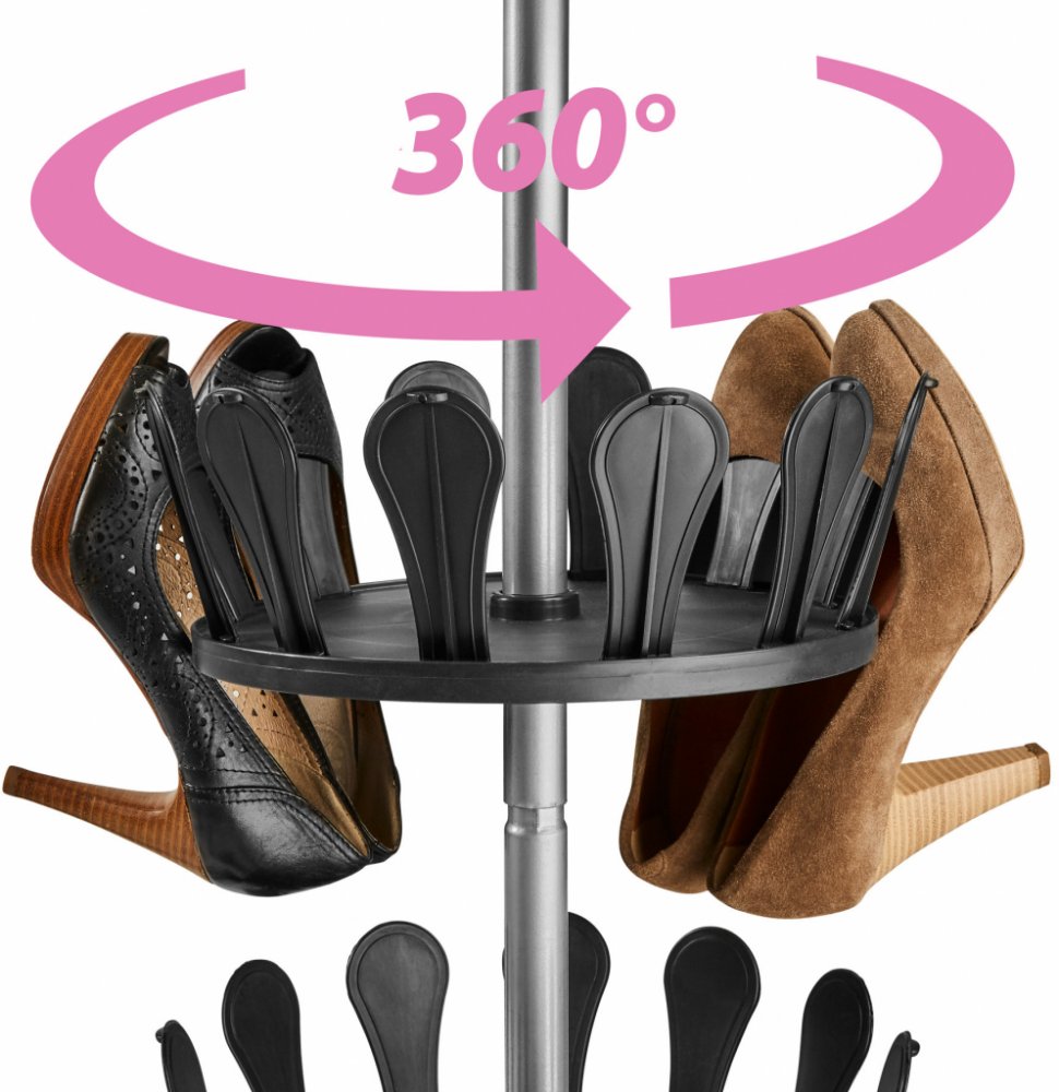 Praktický doplněk do malých domácností – otočný botník TecTake. Zapomeňte na složité úložné systémy a hluboké skříně – pokud potřebujete uložit velké množství bot a jediné místo, které ještě zbývá je malý kout, máme pro vás neocenitelnou vychytávku. Botník pojme až 48 párů bot v osmi úrovních. Díky otočnému systému se snadno a rychle dostanete přesně k tomu páru, který potřebujete. Jednotlivé úrovně můžete individuálně výškově nastavit podle velikosti ukládaných bot. Teleskopická tyč, která se přizpůsobí výšce místnosti, potom zajistí bezpečné ukotvení ke stropu. Samotná montáž je potom otázkou několika okamžiků, bez použití nástrojů. Gumové krytky na obou koncích tyče chrání strop i podlahovou krytinu. Pořiďte si užitečnou alternativu ke klasickým botníkům od společnosti TecTake.