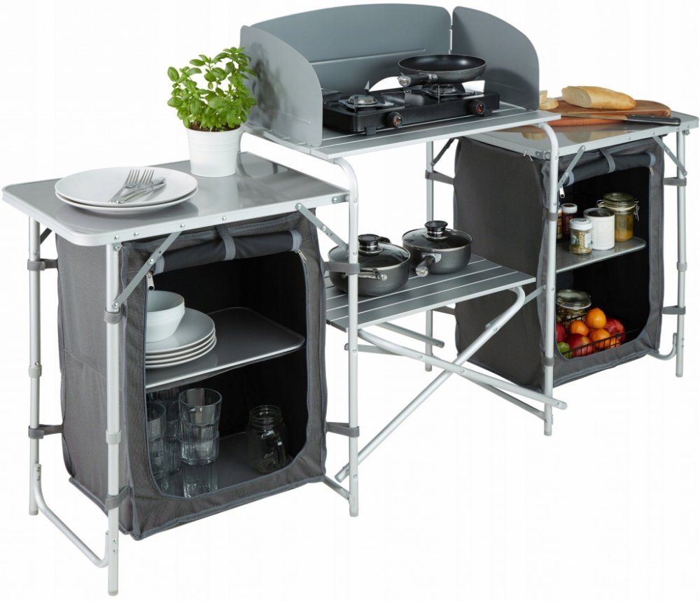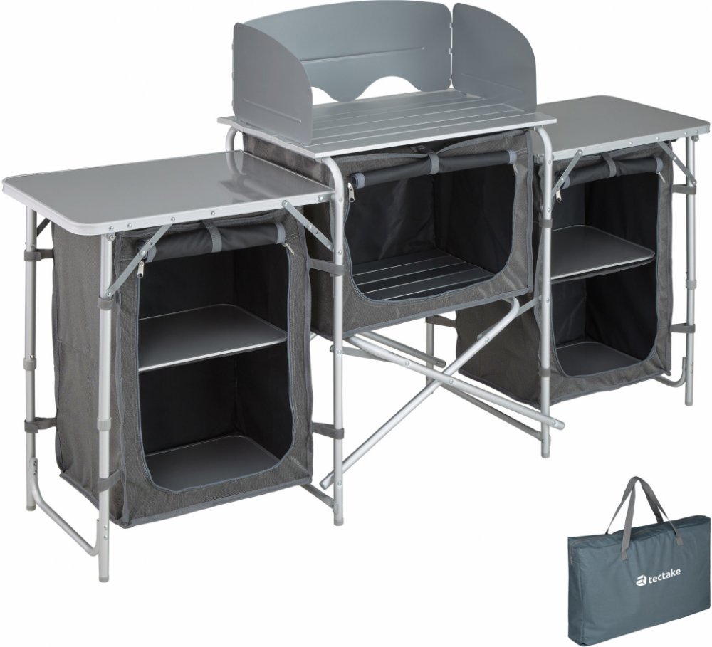Romantika a praktičnost nemusejí být v rozporu! S kempinkovou kuchyňskou sestavou od firmy tectake už při vaření v přírodě nemusíte dělat kompromisy. Sestava je pevná a stabilní, přesto však díky promyšlenému designu váží velmi málo, po složení zabírá velmi málo místa a její postavení i složení jsou dílem okamžiku. Díky nastavitelným nohám můžete sestavu umístit na jakémkoliv místě. Srdcem celé ku...
