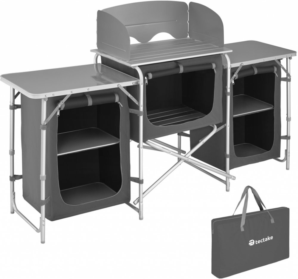 Spojte domácí pohodlí a romantiku táboráku s robustní kempingovou kuchyní od společnosti tectake. Skládací venkovní kuchyni lze sestavit během několika minut. Nerovný povrch není problém díky nastavitelným nožičkám flexibilní kuchyňské linky. Tepelně odolná pracovní deska s praktickou ochranou proti větru je vhodná pro plynový vařič. Na bočních policích a ve třech samostatně uzavíratelných úložných přihrádkách kompaktní modulární kuchyně je dostatek místa na kuchyňské náčiní. Vychutnejte si chutné jídlo i mimo domov s kempingovou kuchyní od společnosti tectake.Nejdůležitější informaceVšestranná modulární kuchyněVelký úložný prostorLze velmi kompaktně složitTepelně odolná pracovní deska s ochranou proti větruVhodná pro plynovou varnou desku2 boční police z tvrdých dřevovláknitých desek3 samostatně uzavíratelné úložné prostory s vnitřními panely vyztuženými hliníkemVelká stabilitaVýškově nastavitelné nožičkyNízká hmotnostJednoduchá montážS přenosnou taškouBarva: šedáTechnické detailyCelkové rozměry (ŠxHxV): cca 172 x 52 x 104 cmRozměry ve složeném stavu (ŠxHxV): cca 81,5 x 52 x 14 cmVětrná clona (ŠxH): cca 62 x 32 cmPracovní deska (šxv): cca 67 x 40 cmVýška pracovní desky: cca 79,5 cmBoční police (šxv): cca 58 x 40 cmVýška bočních polic: cca 72 cmStřed otevírání přihrádek (šxv): cca 43 x 28 cmStřední přihrádka (šxhxv): cca 54,5 x 34 x 35 cmBoční otvory přihrádek (šxv): cca 35 x 47 cmBoční přihrádky (šxhxv): cca 41,5 x 27,5 x 29 cmTloušťka dřevovláknitých desek: cca 0,5 cmPrůměr hliníkových trubek: cca 1,9 - 2,2 cmNastavitelné nožičky: až 1,5 cmNosnost: max. 30 kg (rovnoměrně rozloženo)Hmotnost: cca 10,5 kgMateriál: hliník, dřevovláknitá deska (MDF), polyester (Oxford)Rozsah dodávkyKempinková kuchyňkaNávod k montážiTaška na přenášeníUpozorněníPro tento výrobek nebyla nalezena žádná varování.Pro tento výrobek nebyla nalezena žádná varování.Pro tento výrobek nebyla nalezena žádná varování.