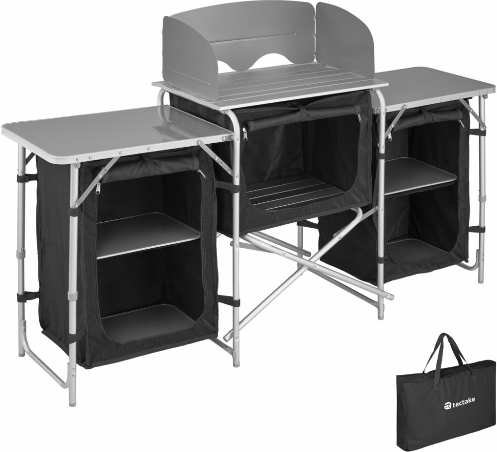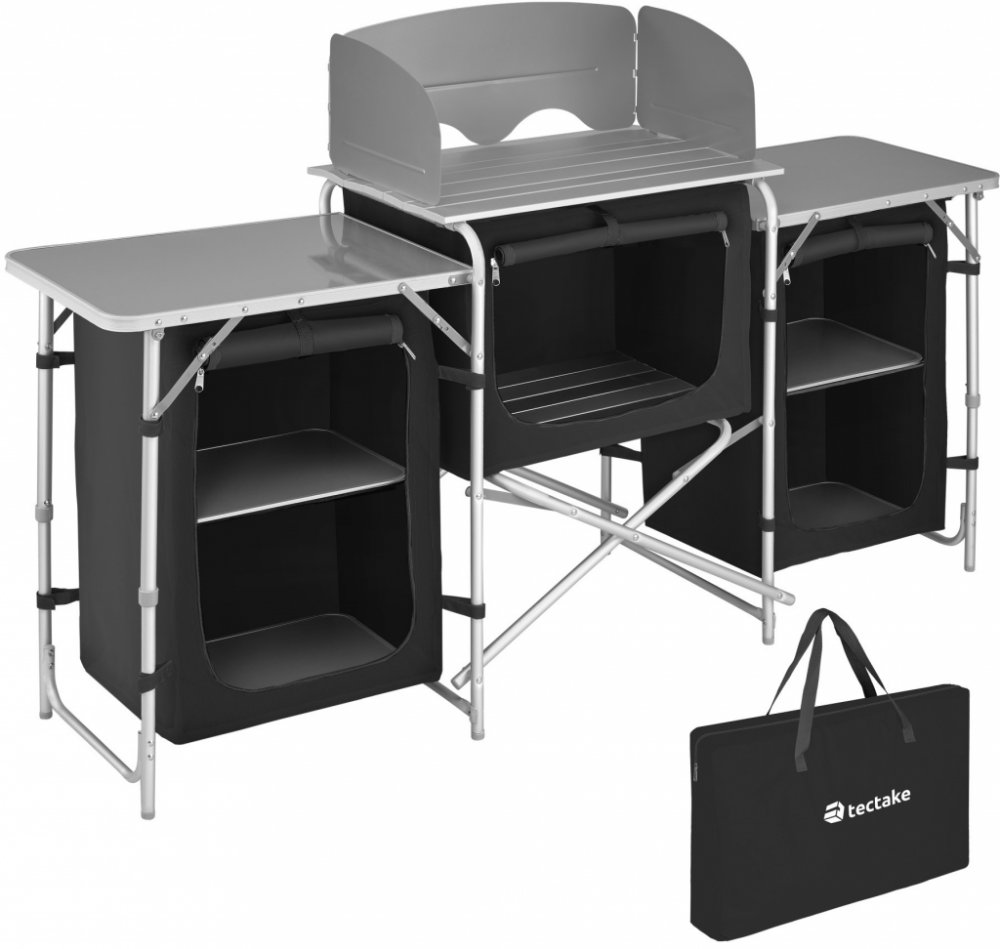 Romantika a praktičnost nemusejí být v rozporu! S kempinkovou kuchyňskou sestavou od firmy tectake už při vaření v přírodě nemusíte dělat kompromisy. Sestava je pevná a stabilní, přesto však díky promyšlenému designu váží velmi málo, po složení zabírá velmi málo místa a její postavení i složení jsou dílem okamžiku. Díky nastavitelným nohám můžete sestavu umístit na jakémkoliv místě. Srdcem celé ku...