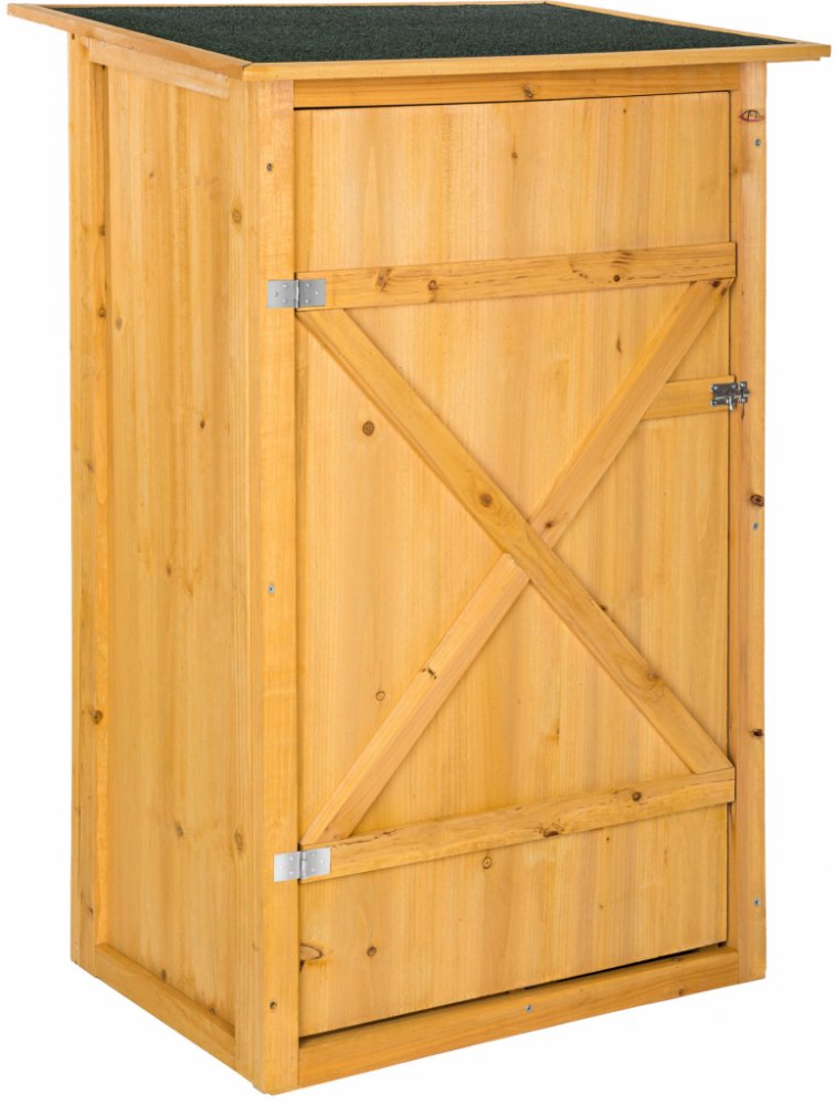 Chcete mít na zahradě pořádek a místo pro uskladnění zahradních doplňků chráněné proti povětrnostním vlivům? Vhodným řešením bude zahradní šatní skříň s plochou střechou. Do dvou polic se vejdou drobné zahradní doplňky, vedle je dostatek místa pro trochu větší předměty. Velké dveře jsou zavřené na závoru. Plochá střecha zahradní skříně je pokryta bitumenovým dehtovým papírem pro ochranu před povětrnostními vlivy. Střecha je navíc mírně vyspádována, aby mohla voda odtékat.