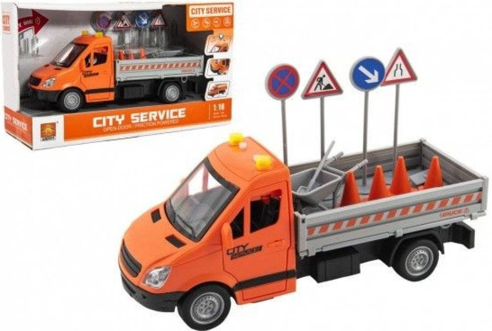 Silničářské auto plné dopravních značek a pomůcek potřebných pro práci každého silničáře. Údržba silnic, chodníků a parků je důležitá v každé obci a městě. Auto je v měřítku 1:16, je na setrvačník, se světlem a se zvukem. Baterie 3x AG13 jsou součástí balení.