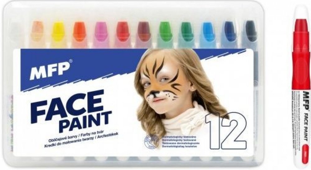 Barvy na obličej a tělo 12 ks Obličejové barvy 12 odstínů. Jednoduše umyvatelné vodou a mýdlem. Nedoporučujeme nechávat na obličeji déle než 24 hodin. Nepoužívejte na rty a oči.