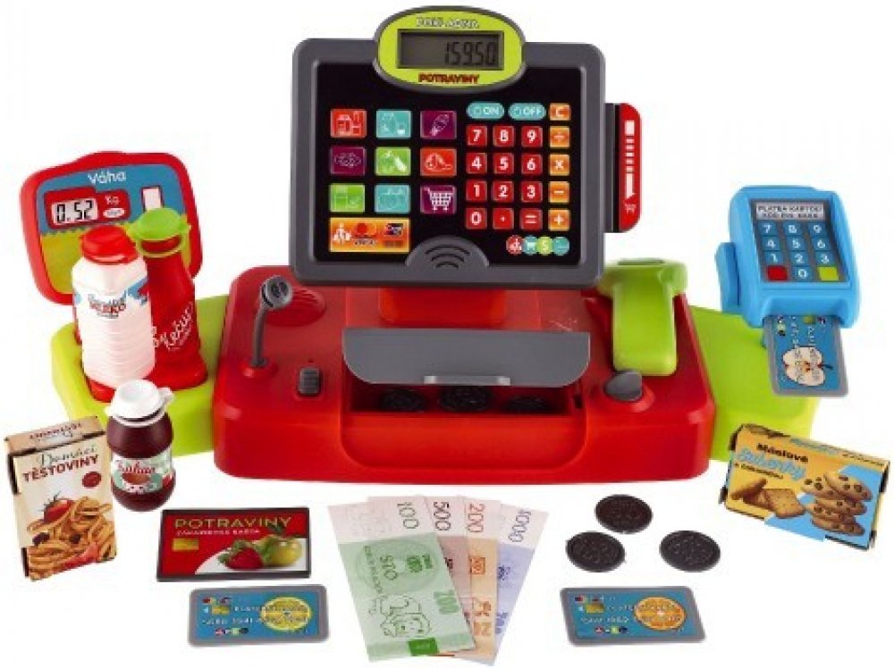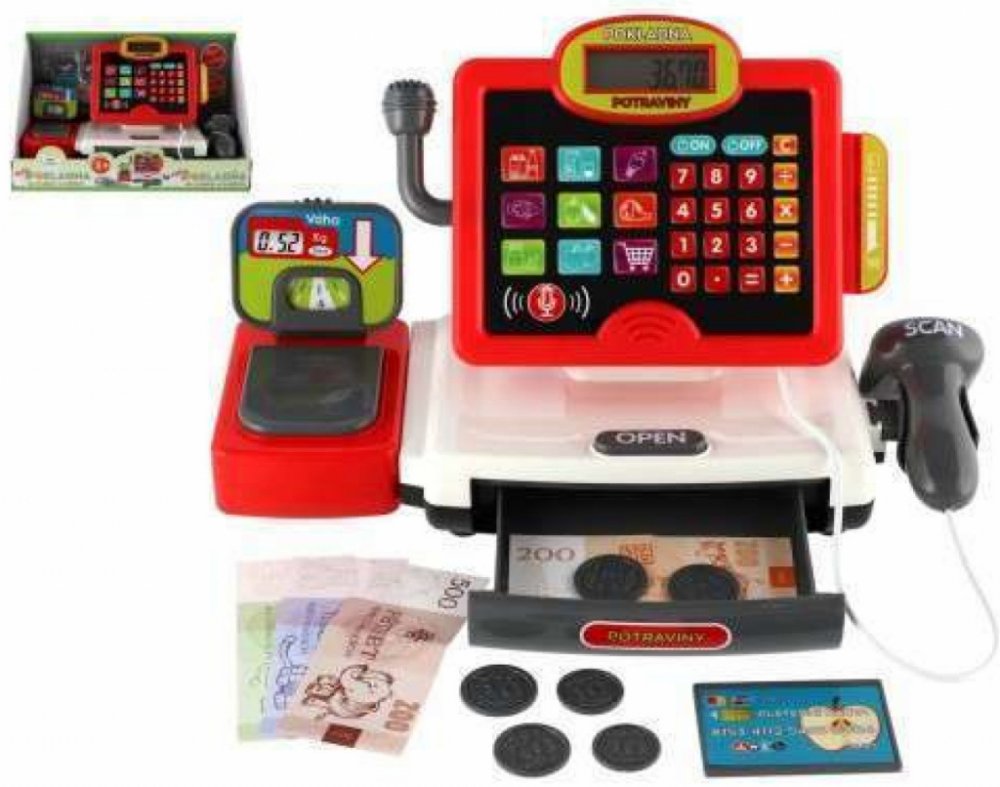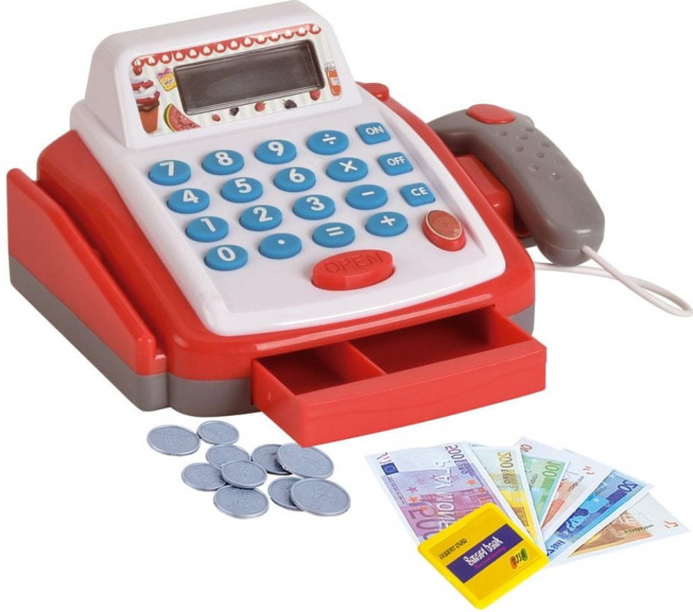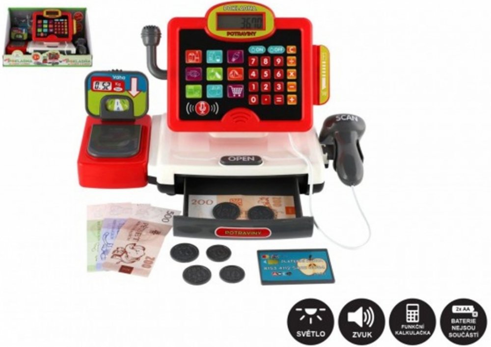 Dětská elektronická pokladna s doplňky pro každý správný obchod. Obsahuje: funkční kalkulačku s displejem, otevírací zásuvku s penězi a světlem a zvukem u čtečky čárových kódů.
