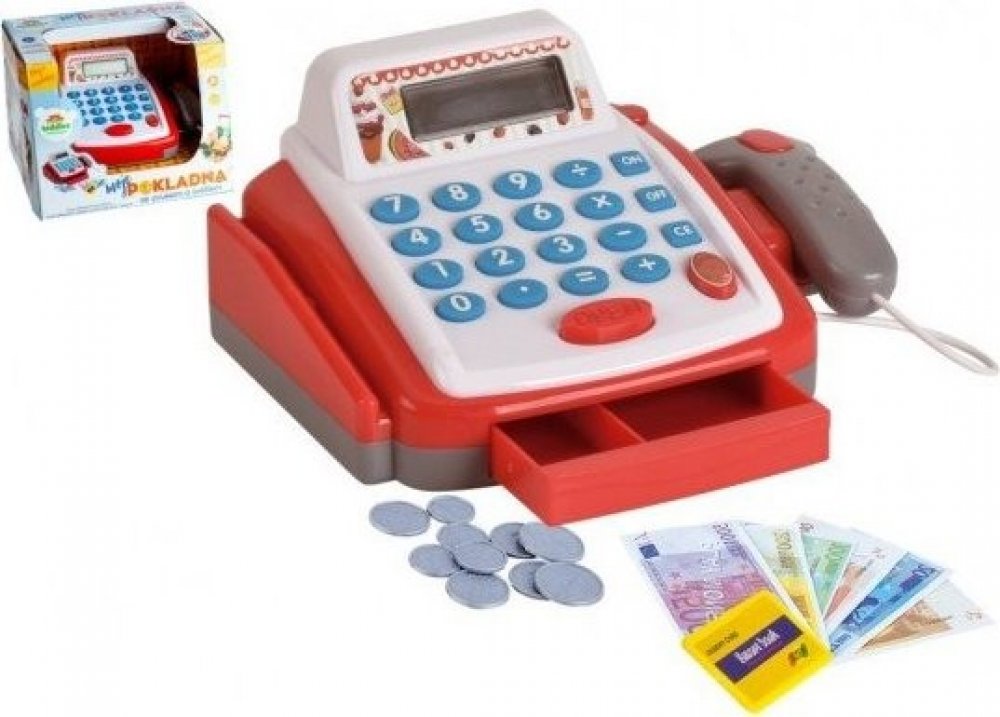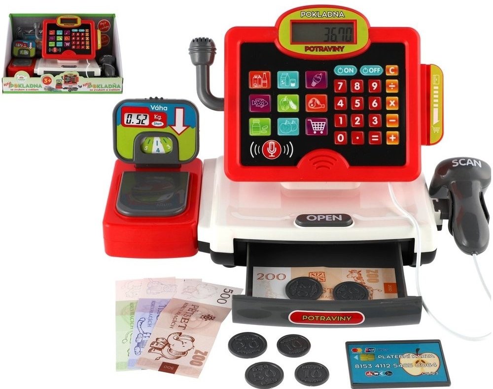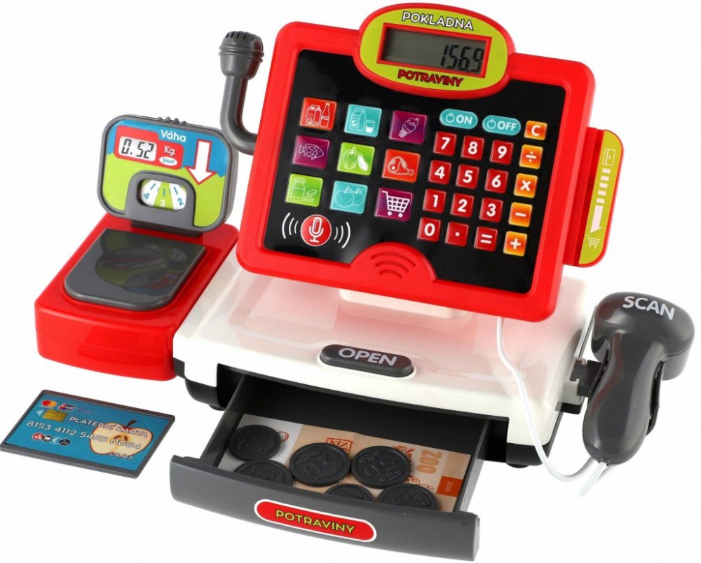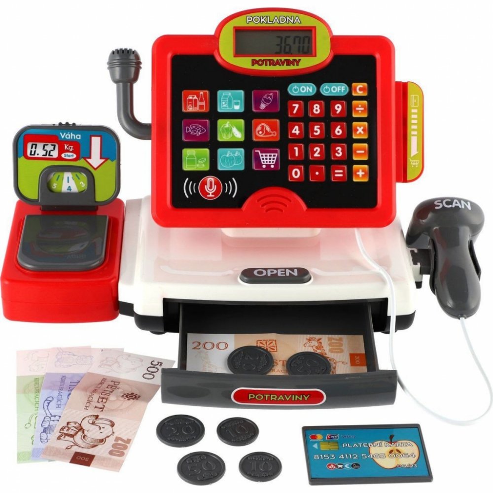 Dětská elektronická pokladna s doplňky pro každý správný obchod. Obsahuje: funkční kalkulačku s displejem, otevírací zásuvku s penězi a světlem a zvukem u čtečky čárových kódů.