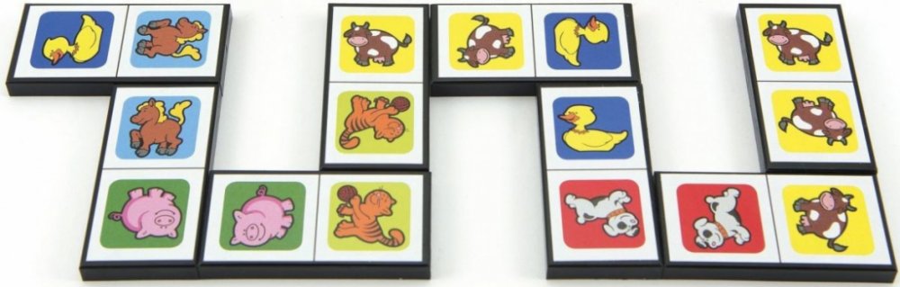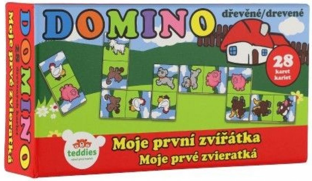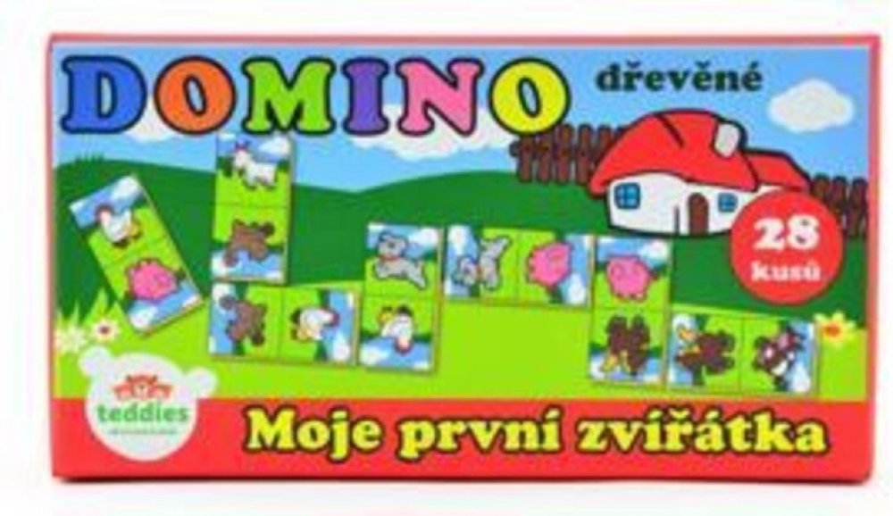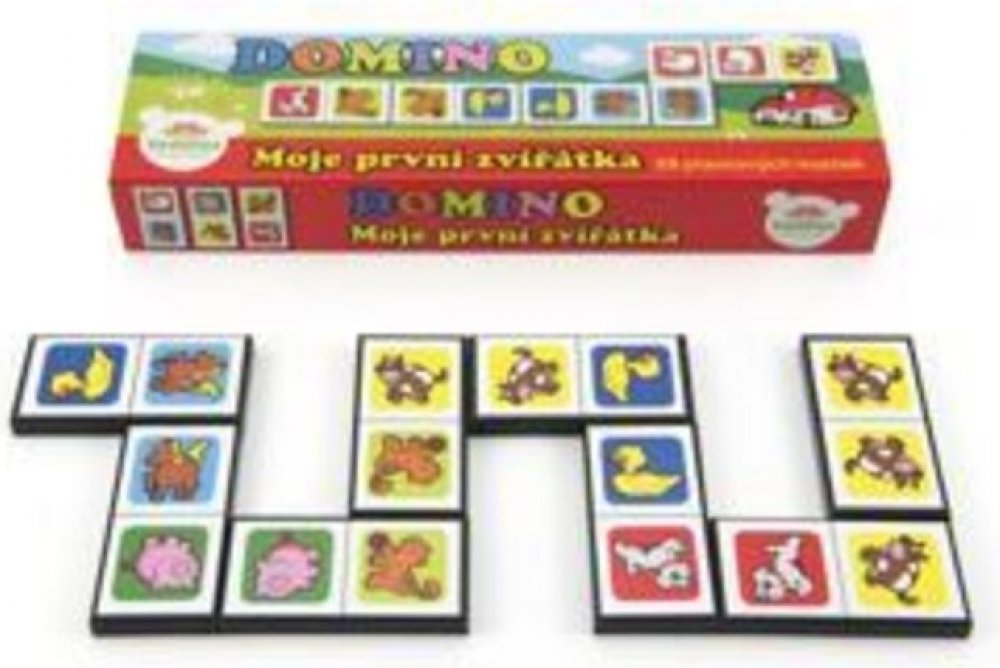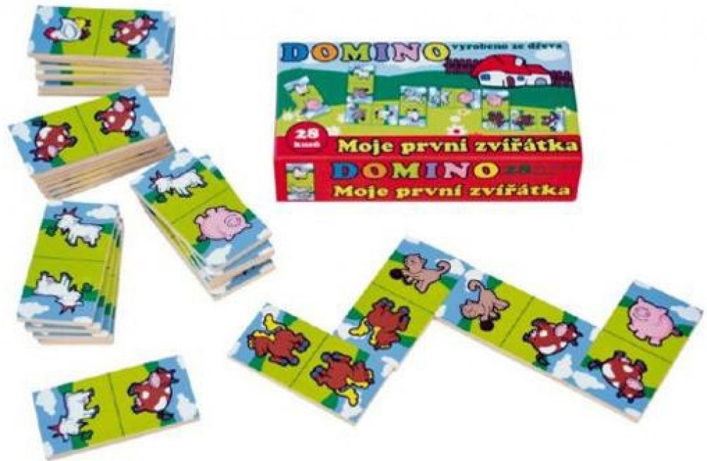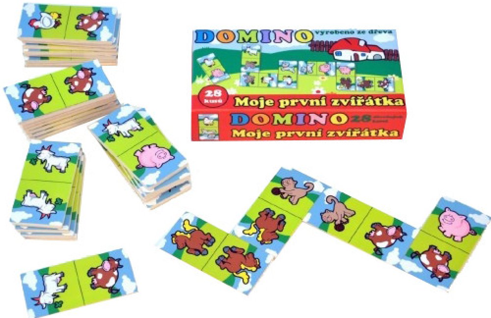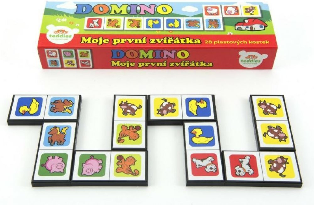 Klasická hra domino se zvířátky určená pro děti, kterým ještě nejde počítání. Obsahuje: 28 plastových kartiček, v krabičce 21 x 6 x 3 cm.
