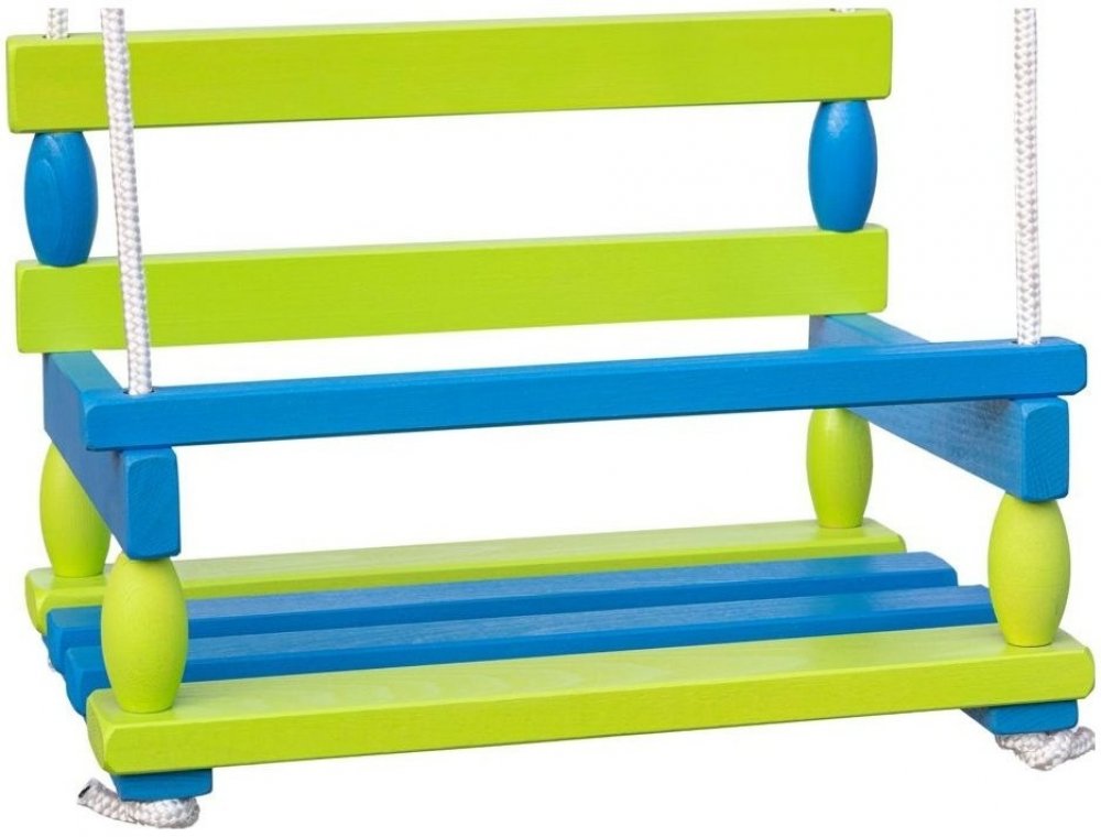 Krásná dřevěná houpačka v modro zelené barvě. Vhodná pro použití doma i na zahradě. Houpačka je bezpečná a stabilní.