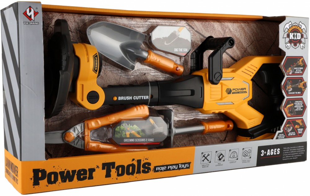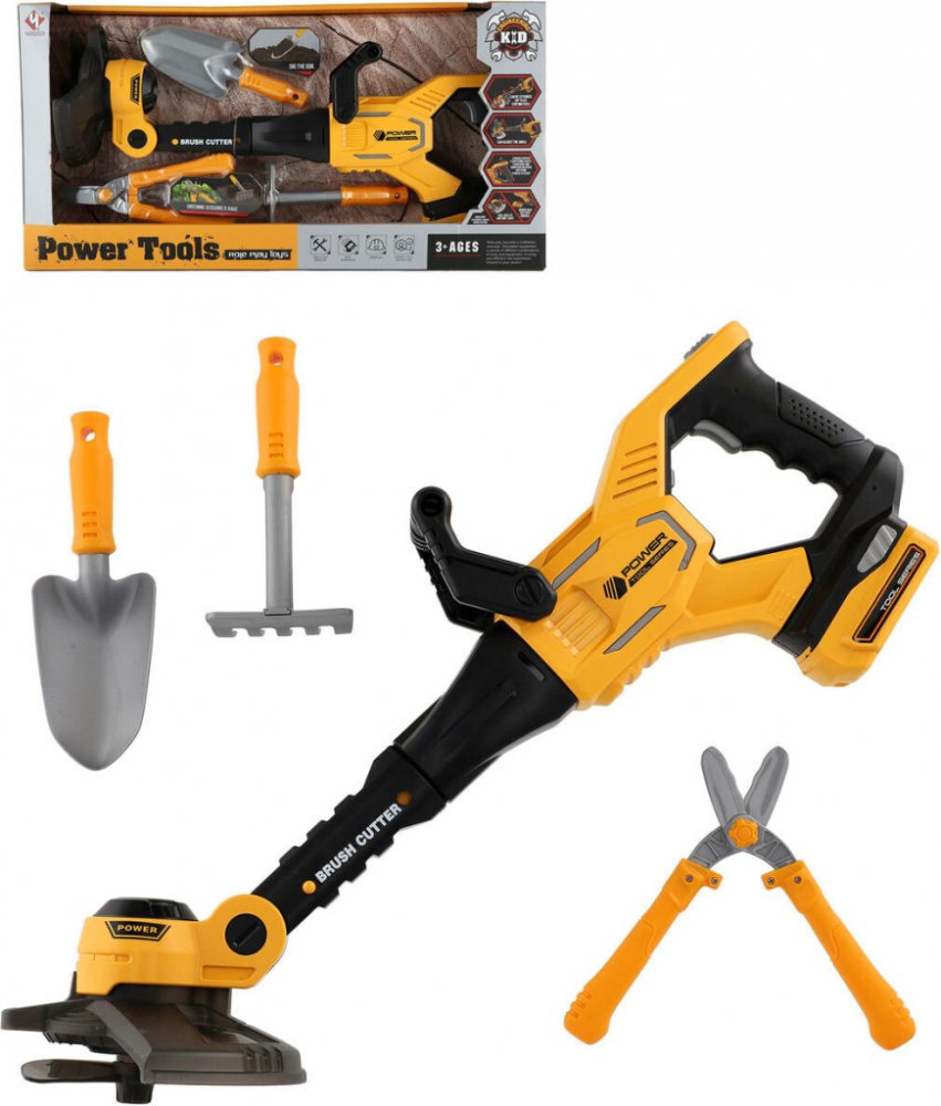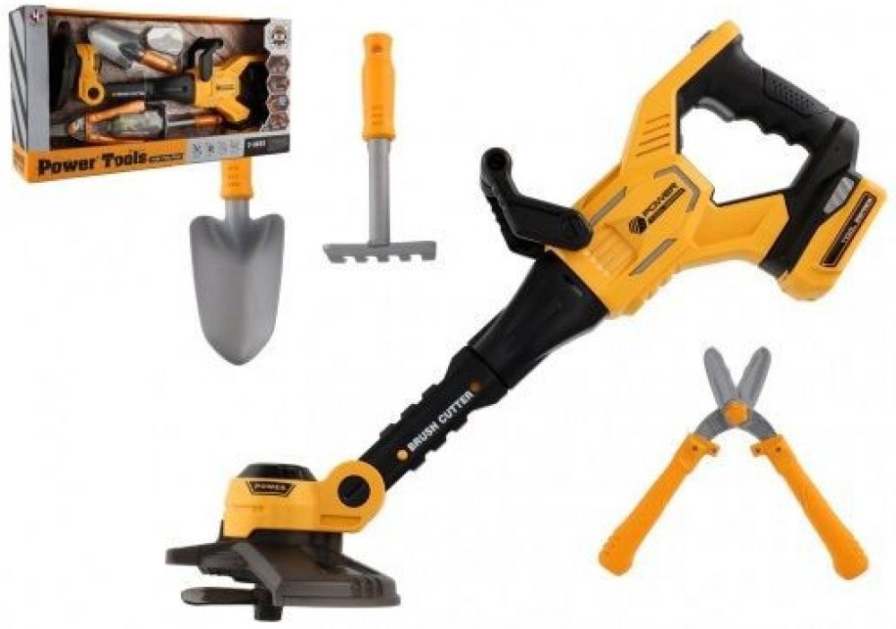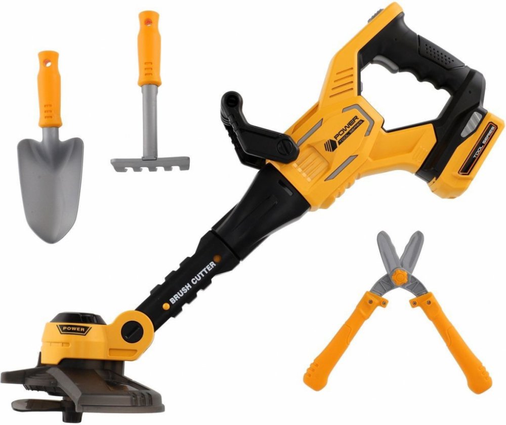 Plastový křovinořez. Dětské pracovní zahradnické nářadí. Realistické provedení. Součástí lopatka, hrábě a zahradnické nůžky. Hračka na baterie, se světlem a zvukem.
