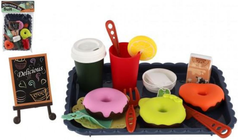Tato pestrá čajová a kuchyňská sada je skvělá pro každodenní hraní na kuchyň i stylové pohoštění. Děti mohou servírovat koblihy, sušenky a nápoje, nalévat "čaj" z konvičky a stolovat s vlastním plastovým příborem. Díky bezpečnému plastovému provedení je sada lehká, odolná a snadno se udržuje.Součástí je dekorativní modrý tác, hrníček na kávu, malá konvička, láhev/kelímek, pouzdro mléka, příbory a různé sladké dobroty. Sada skvěle rozvíjí sociální dovednosti, komunikaci a fantazii při hře s kamarády.Bohatá výbava pro realistickou hru na vaření a kavárnuBezpečný plast bez ostrých hran, vhodný od 3 letSnadná údržba – stačí otřít vlhkým hadříkemIdeální dárek pro malé kuchaře a kuchařkySpecifikaceVěk3+MateriálplastObsah sadytác, hrníčky/kelímky, konvička, příbory, makety potravin (kobliha, sušenka aj.)Rozměry balení20,5 × 30 × 6 cmHlavní činnostirole-play, servírování, stolování, rozvoj jemné motorikyÚdržbaotřít vlhkým hadříkem